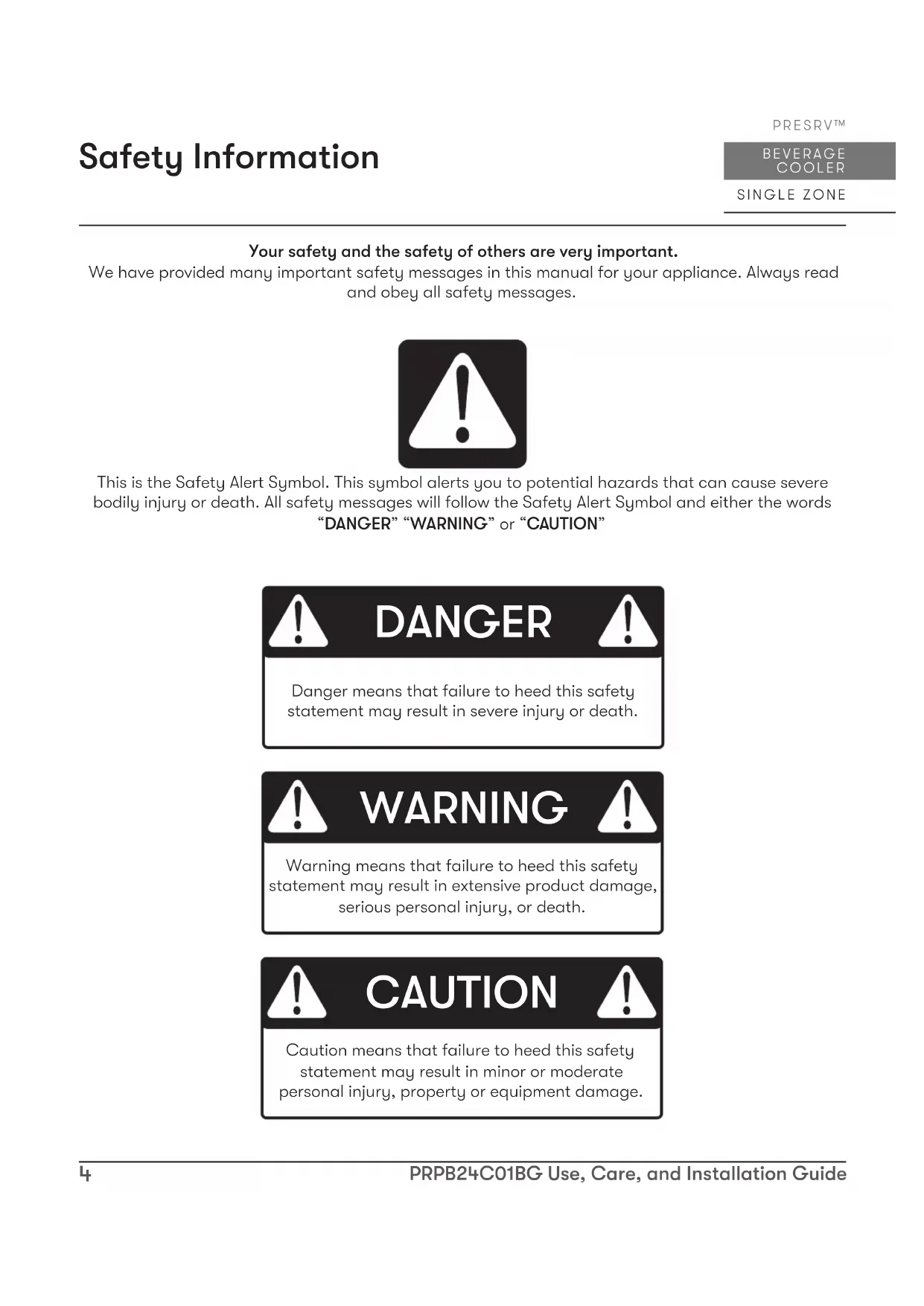 - Presrv™ Pro Single Zone Beverage Cooler EN Use, Care, and Installation Guide FR Guide d’utilisation, d’entretien et d’installation2 PRPB24C01BG Use, Care, and Installation Guide BEVERAGE COOLER SINGLE ZONE PRESRV™3 PRPB24C01BG Use, Care, and Installation Guide ZEPHYRONLINE.COM Contents Page Safety Information p. 4