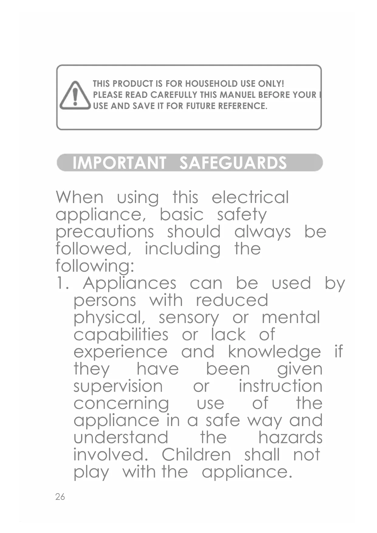 persons with reduced physical, sensory or mental capabilities or lack of experience and knowledge if they have been given supervision or instruction concerning use of the appliance in a safe way and understand the hazards involved. Children shall not play with the appliance. THIS PRODUCT IS FOR HOUSEHOLD USE ONLY! PLEASE READ CAREFULLY THIS MANUEL BEFORE YOUR FIRST USE AND SAVE IT FOR FUTURE REFERENCE.27