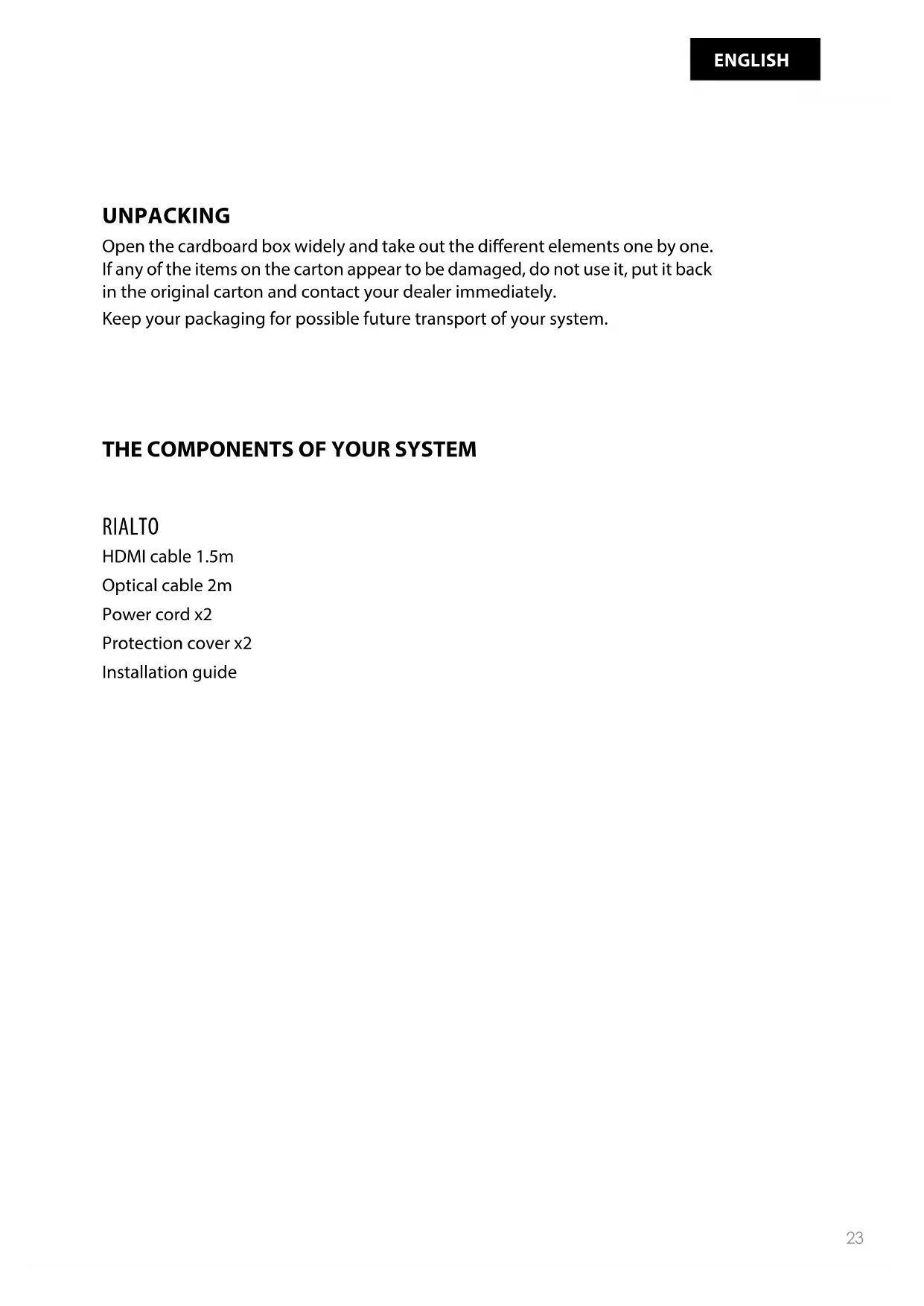 FRANÇAIS22 RIALTORIALTO User guideUNPACKING Open the cardboard box widely and take out the dierent elements one by one. If any of the items on the carton appear to be damaged, do not use it, put it back in the original carton and contact your dealer immediately. Keep your packaging for possible future transport of your system.