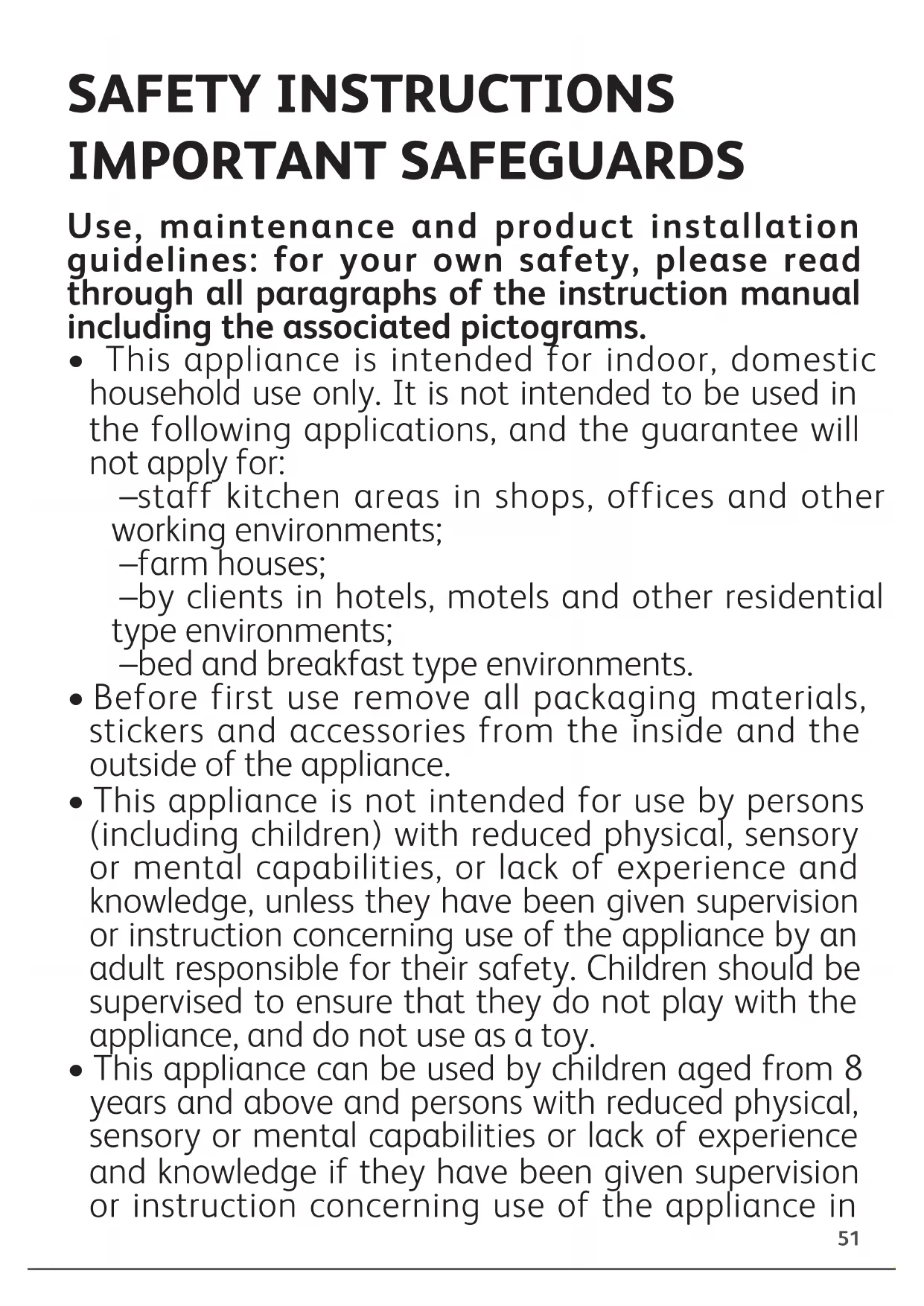 - This appliance is intended for indoor, domestic household use only. It is not intended to be used in the following applications, and the guarantee will not apply for: –staff kitchen areas in shops, offices and other working environments; –farm houses; –by clients in hotels, motels and other residential type environments; –bed and breakfast type environments.