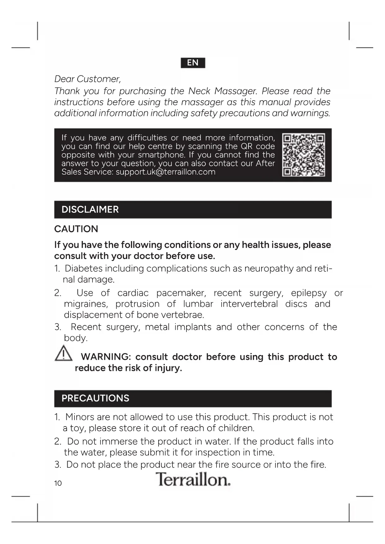 Dear Customer, Thank you for purchasing the Neck Massager. Please read the instructions before using the massager as this manual provides additional information including safety precautions and warnings. If you have any difficulties or need more information, you can find our help centre by scanning the QR code opposite with your smartphone If you cannot find the answer to your question, you can also contact our After Sales Service: supportuk@terrailloncom DISCLAIMER PRECAUTIONS CAUTION If you have the following conditions or any health issues, please consult with your doctor before use. 1 Diabetes including complications such as neuropathy and reti- nal damage 2 Use of cardiac pacemaker, recent surgery, epilepsy or migraines, protrusion of lumbar intervertebral discs and displacement of bone vertebrae 3 Recent surgery, metal implants and other concerns of the body