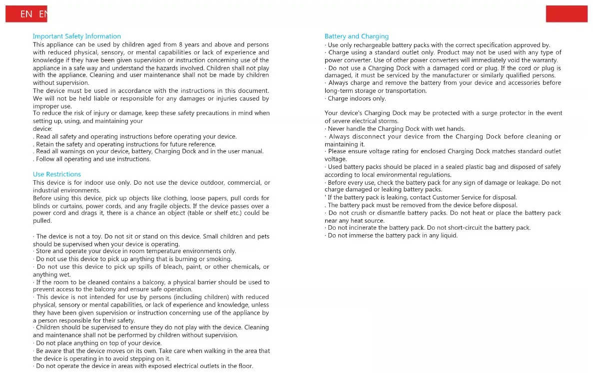 RV-500 QUICK GUIDE Robot Vacuum Cleaner EN DE ESFR PTNL IT PLEN EN Important Safety Information This appliance can be used by children aged from 8 years and above and persons with reduced physical, sensory, or mental capabilities or lack of experience and knowledge if they have been given supervision or instruction concerning use of the appliance in a safe way and understand the hazards involved. Children shall not play with the appliance. Cleaning and user maintenance shall not be made by children without supervision. The device must be used in accordance with the instructions in this document. We will not be held liable or responsible for any damages or injuries caused by improper use. To reduce the risk of injury or damage, keep these safety precautions in mind when setting up, using, and maintaining your device: . Read all safety and operating instructions before operating your device. . Retain the safety and operating instructions for future reference. . Read all warnings on your device, battery, Charging Dock and in the user manual. . Follow all operating and use instructions. Use Restrictions This device is for indoor use only. Do not use the device outdoor, commercial, or industrial environments. Before using this device, pick up objects like clothing, loose papers, pull cords for blinds or curtains, power cords, and any fragile objects. If the device passes over a power cord and drags it, there is a chance an object (table or shelf etc.) could be pulled.