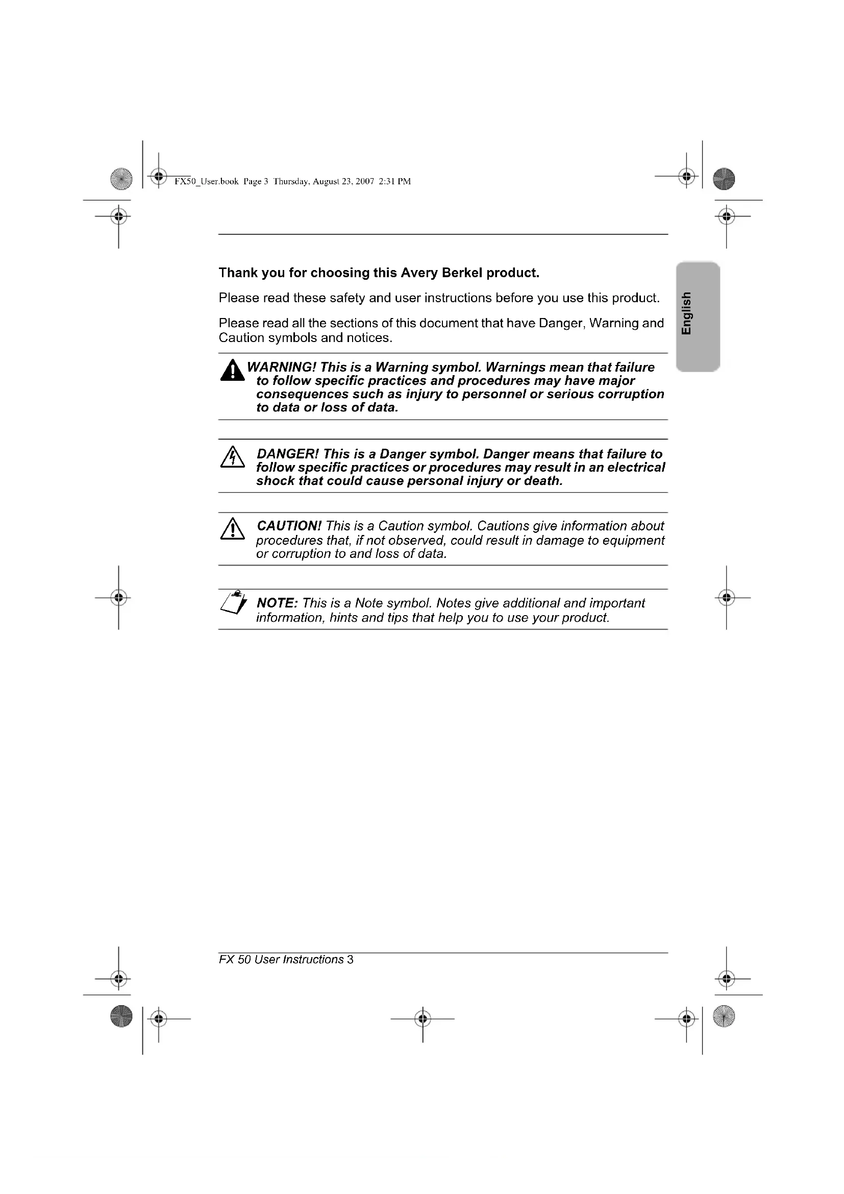FX50_User.book Page 2 Thursday, August 23, 2007 2:31 PMEnglish FX 50 User Instructions 3 Thank you for choosing this Avery Berkel product. Please read these safety and user instructions before you use this product. Please read all the sections of this document that have Danger, Warning and Caution symbols and notices. W WARNING! This is a Warning symbol. Warnings mean that failure to follow specific practices and procedures may have major consequences such as injury to personnel or serious corruption to data or loss of data. D DANGER! This is a Danger symbol. Danger means that failure to follow specific practices or procedures may result in an electrical shock that could cause personal injury or death. C CAUTION! This is a Caution symbol. Cautions give information about procedures that, if not observed, could result in damage to equipment or corruption to and loss of data. N NOTE: This is a Note symbol. Notes give additional and important information, hints and tips that help you to use your product. FX50_User.book Page 3 Thursday, August 23, 2007 2:31 PMFX50_User.book Page 4 Thursday, August 23, 2007 2:31 PMEnglish
