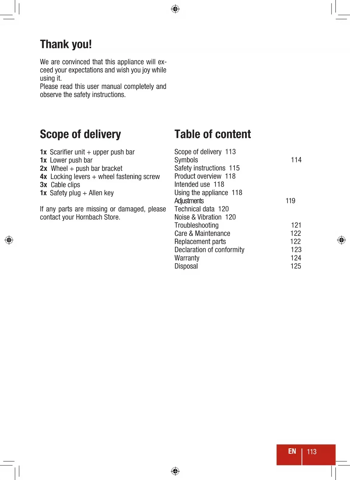 Thank you! We are convinced that this appliance will ex- ceed your expectations and wish you joy while using it. Please read this user manual completely and observe the safety instructions. Scope of delivery 1x Scarifier unit + upper push bar 1x Lower push bar 2x Wheel + push bar bracket 4x Locking levers + wheel fastening screw 3x Cable clips 1x Safety plug + Allen key If any parts are missing or damaged, please contact your Hornbach Store. Table of content Scope of delivery 113 Symbols 114 Safety instructions 115 Product overview 118 Intended use 118 Using the appliance 118 Adjustments 119 Technical data 120 Noise & Vibration 120 Troubleshooting 121 Care & Maintenance 122 Replacement parts 122 Declaration of conformity 123 Warranty 124 Disposal 125EN