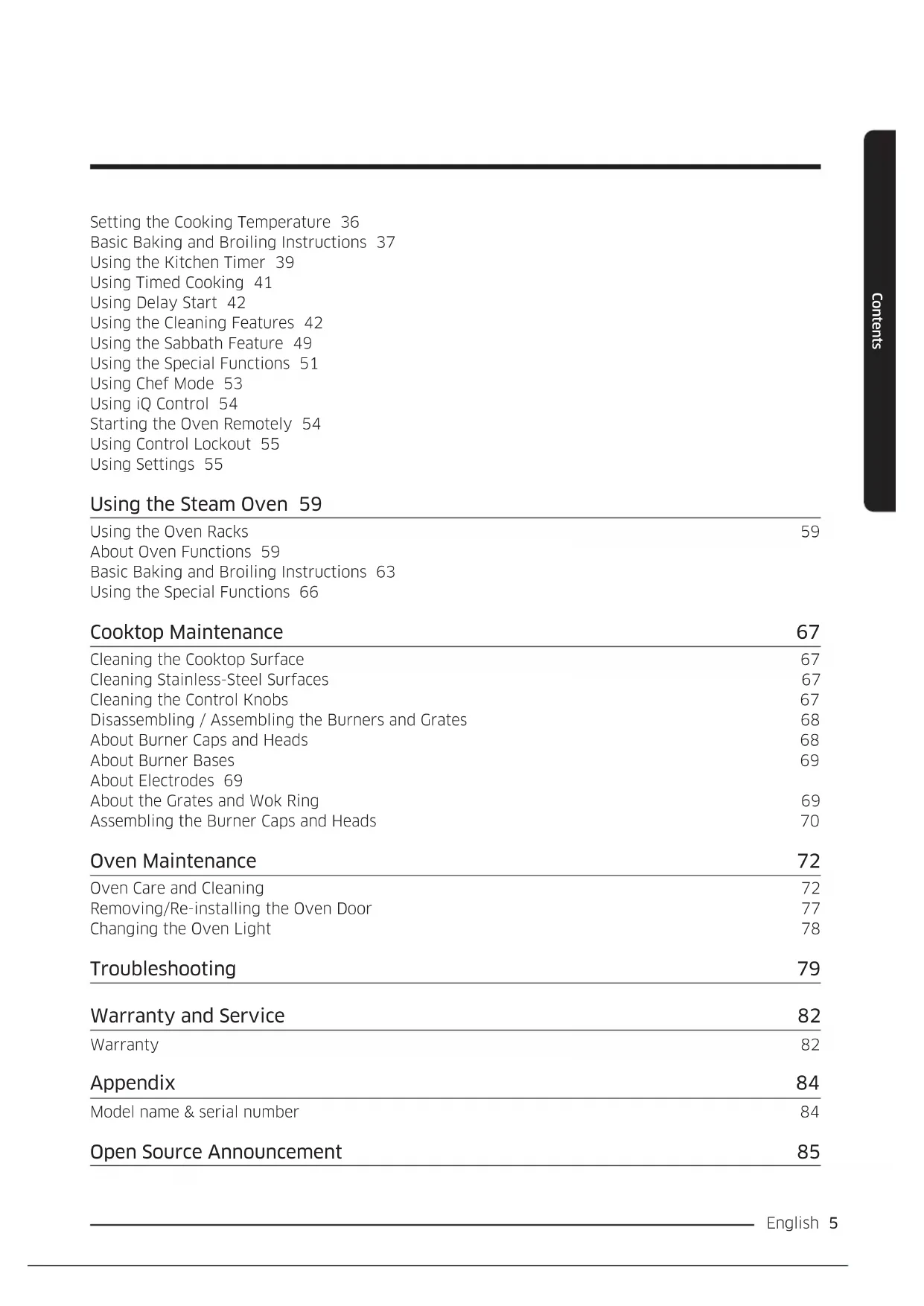 - Installation and service must be performed by a qualied installer, service agency, or the gas supplier. ANTI-TIP DEVICE WARNING To reduce the risk of tipping the range, the range must be secured by a properly installed Anti-Tip device. AFTER THE RANGE HAS BEEN INSTALLED, CONFIRM THAT THE ANTI-TIP DEVICE HAS BEEN PROPERLY INSTALLED AND VERIFY THAT THE ANTI-TIP DEVICE IS PROPERLY ENGAGED. Refer to the installation manual for instructions.English 3 a) If the anti-tip device is not installed, a child or adult can tip the range and be killed. b) Verify the anti-tip device has been properly installed and engaged at the rear right (or rear left) of the range bottom. c) If you move the range and then move it back into place, ensure the anti-tip device is re-engaged at the right or left rear of the range bottom. d) Do not operate the range without the anti-tip device in place and engaged. Failure to do so can result in death or serious burns to children or adults. WARNING Do not step, lean, or sit on the oven door of the range. You can cause the range to tip, resulting in burns or serious injuries. Conrm that the Anti-Tip device is installed properly. Then, to verify that the Anti-Tip device is engaged, grasp the top rear edge of the range and carefully attempt to tilt it forward. The Anti-Tip device should prevent the range from tilting forward more than a few inches. If you pull the range out from the wall for any reason, make sure the anti-tip device is properly engaged when you push the range back against the wall. If it is not, there is a risk of the range tipping over and causing injury if you or a child stand, sit or lean on an open door. Never completely remove the leveling legs. If you remove the leveling legs, the range will not be secured to the anti-tip device properly.Contents Before You Begin 7 Important Notes to the Owner 7 Energy-Saving Tips 7 Using the Water Reservoir 7 About the Oven Vent 9 Regulatory Notice 10 Important Safety Instructions 12 Read All Instructions Before Using This Appliance 12 Symbols In This Manual 12 California Proposition 65 Warning 12 Commonwealth of Massachusetts 12 General Safety 13 Fire Safety 13 Gas Safety 14 Electrical and Grounding Safety 14 Installation Safety 15 Location Safety 15 Cooktop Safety 16 Oven Safety 17 Self-Cleaning Safety 17 Overview 18 External Features 18 Control Panel (DOP48M86D**) 19 Control Panel (DOP36M86D**) 19 Display (DOP48M86D** Only) 20 Display (DOP36M86D** Only) 21 What is Included 22 Using the Cooktop 24 About the Burners 24 About Burner Ignition 25 Using the Proper Cookware 26 Special Cooktop Features 27 About the Grates 27 About the Wok Ring 28 Using the Basic Oven 29 Basic Settings: Clock, Date&Time, Language 29 Using the Oven Racks 29 Using the Gliding Rack 30 Using the Temp Probe 32 About Oven Functions 33 Setting the Cooking Mode 36 English4 ContentsEnglish 5 Contents Setting the Cooking Temperature 36 Basic Baking and Broiling Instructions 37 Using the Kitchen Timer 39 Using Timed Cooking 41 Using Delay Start 42 Using the Cleaning Features 42 Using the Sabbath Feature 49 Using the Special Functions 51 Using Chef Mode 53 Using iQ Control 54 Starting the Oven Remotely 54 Using Control Lockout 55 Using Settings 55 Using the Steam Oven 59 Using the Oven Racks 59 About Oven Functions 59 Basic Baking and Broiling Instructions 63 Using the Special Functions 66 Cooktop Maintenance 67 Cleaning the Cooktop Surface 67 Cleaning Stainless-Steel Surfaces 67 Cleaning the Control Knobs 67 Disassembling / Assembling the Burners and Grates 68 About Burner Caps and Heads 68 About Burner Bases 69 About Electrodes 69 About the Grates and Wok Ring 69 Assembling the Burner Caps and Heads 70 Oven Maintenance 72 Oven Care and Cleaning 72 Removing/Re-installing the Oven Door 77 Changing the Oven Light 78 Troubleshooting 79 Warranty and Service 82 Warranty 82