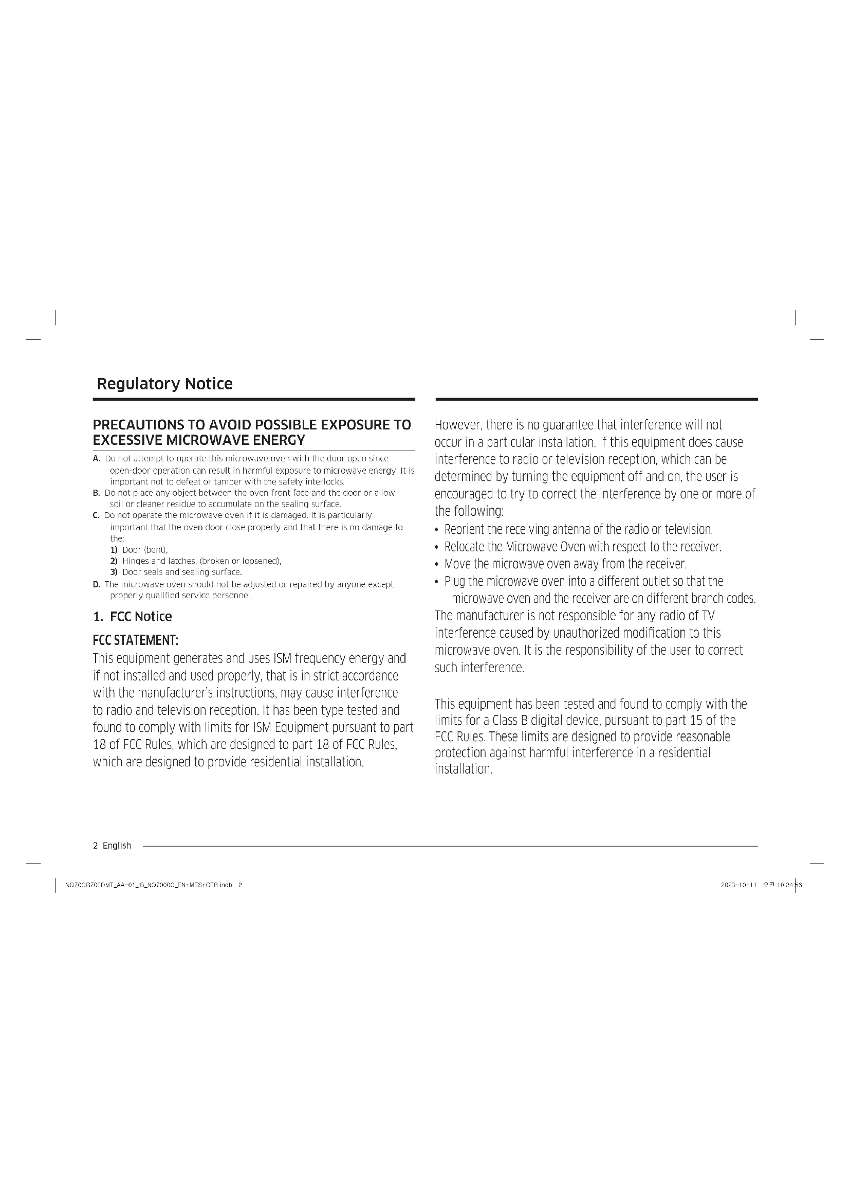 FCC STATEMENT: This equipment generates and uses ISM frequency energy and if not installed and used properly, that is in strict accordance with the manufacturer’s instructions, may cause interference to radio and television reception. It has been type tested and found to comply with limits for ISM Equipment pursuant to part 18 of FCC Rules, which are designed to part 18 of FCC Rules, which are designed to provide residential installation. NQ70CG700DMT_AA-01_IB_NQ7000C_EN+MES+CFR.indb 2NQ70CG700DMT_AA-01_IB_NQ7000C_EN+MES+CFR.indb 2 2023-10-11 오전 10:34:562023-10-11 오전 10:34:56English 3 Regulatory Notice