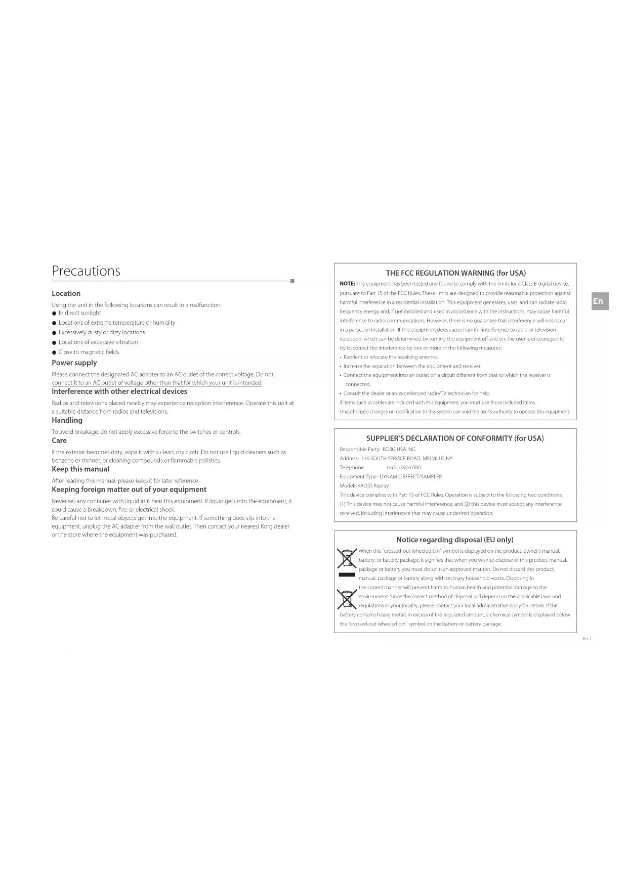 Close to magnetic elds Power supply Please connect the designated AC adapter to an AC outlet of the correct voltage. Do not connect it to an AC outlet of voltage other than that for which your unit is intended. Interference with other electrical devices Radios and televisions placed nearby may experience reception interference. Operate this unit at a suitable distance from radios and televisions. Handling To avoid breakage, do not apply excessive force to the switches or controls. Care If the exterior becomes dirty, wipe it with a clean, dry cloth. Do not use liquid cleaners such as benzene or thinner, or cleaning compounds or ammable polishes. Keep this manual After reading this manual, please keep it for later reference. Keeping foreign matter out of your equipment Never set any container with liquid in it near this equipment. If liquid gets into the equipment, it could cause a breakdown, re, or electrical shock. Be careful not to let metal objects get into the equipment. If something does slip into the equipment, unplug the AC adapter from the wall outlet. Then contact your nearest Korg dealer or the store where the equipment was purchased. THE FCC REGULATION WARNING (for USA) NOTE: This equipment has been tested and found to comply with the limits for a Class B digital device, pursuant to Part 15 of the FCC Rules. These limits are designed to provide reasonable protection against harmful interference in a residential installation. This equipment generates, uses, and can radiate radio frequency energy and, if not installed and used in accordance with the instructions, may cause harmful interference to radio communications. However, there is no guarantee that interference will not occur in a particular installation. If this equipment does cause harmful interference to radio or television reception, which can be determined by turning the equipment o and on, the user is encouraged to try to correct the interference by one or more of the following measures:• Reorient or relocate the receiving antenna.• Increase the separation between the equipment and receiver.• Connect the equipment into an outlet on a circuit dierent from that to which the receiver is connected.• Consult the dealer or an experienced radio/TV technician for help.If items such as cables are included with this equipment, you must use those included items.Unauthorized changes or modication to this system can void the user’s authority to operate this equipment. SUPPLIER’S DECLARATION OF CONFORMITY (for USA) Responsible Party: KORG USA INC.Address: 316 SOUTH SERVICE ROAD, MELVILLE, NYTelephone: 1-631-390-6500Equipment Type: DYNAMIC EFFECT/SAMPLERModel: KAOSS ReplayThis device complies with Part 15 of FCC Rules. Operation is subject to the following two conditions:(1) This device may not cause harmful interference, and (2) this device must accept any interference received, including interference that may cause undesired operation. Notice regarding disposal (EU only) When this “crossed-out wheeled bin” symbol is displayed on the product, owner’s manual, battery, or battery package, it signies that when you wish to dispose of this product, manual, package or battery you must do so in an approved manner. Do not discard this product, manual, package or battery along with ordinary household waste. Disposing inthe correct manner will prevent harm to human health and potential damage to the environment. Since the correct method of disposal will depend on the applicable laws and regulations in your locality, please contact your local administrative body for details. If the battery contains heavy metals in excess of the regulated amount, a chemical symbol is displayed below the “crossed-out wheeled bin” symbol on the battery or battery package.En-2
