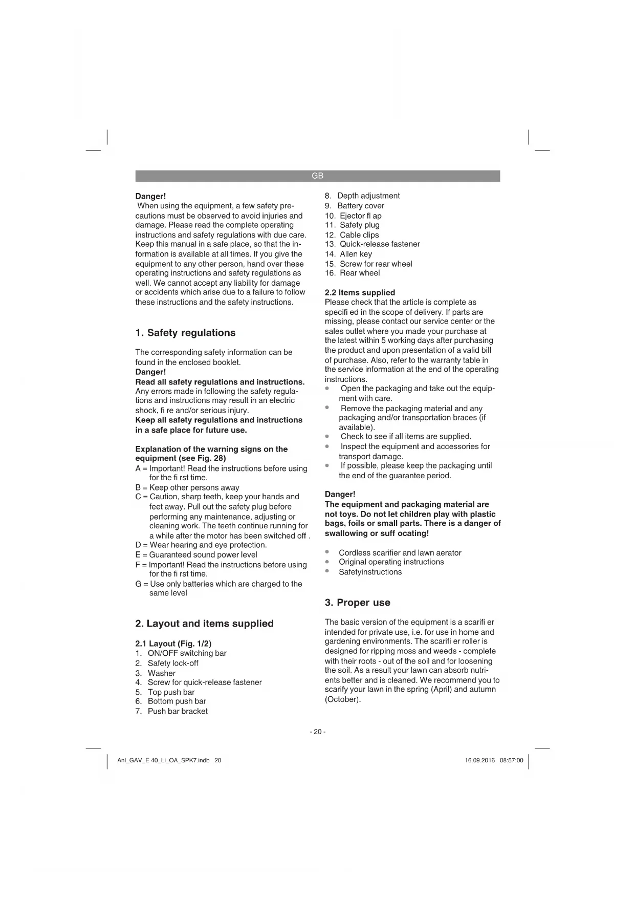 The basic version of the equipment is a scarifi er intended for private use, i.e. for use in home and gardening environments. The scarifi er roller is designed for ripping moss and weeds - complete with their roots - out of the soil and for loosening the soil. As a result your lawn can absorb nutri- ents better and is cleaned. We recommend you to scarify your lawn in the spring (April) and autumn (October). Anl_GAV_E 40_Li_OA_SPK7.indb 20Anl_GAV_E 40_Li_OA_SPK7.indb 20 16.09.2016 08:57:0016.09.2016 08:57:00GB