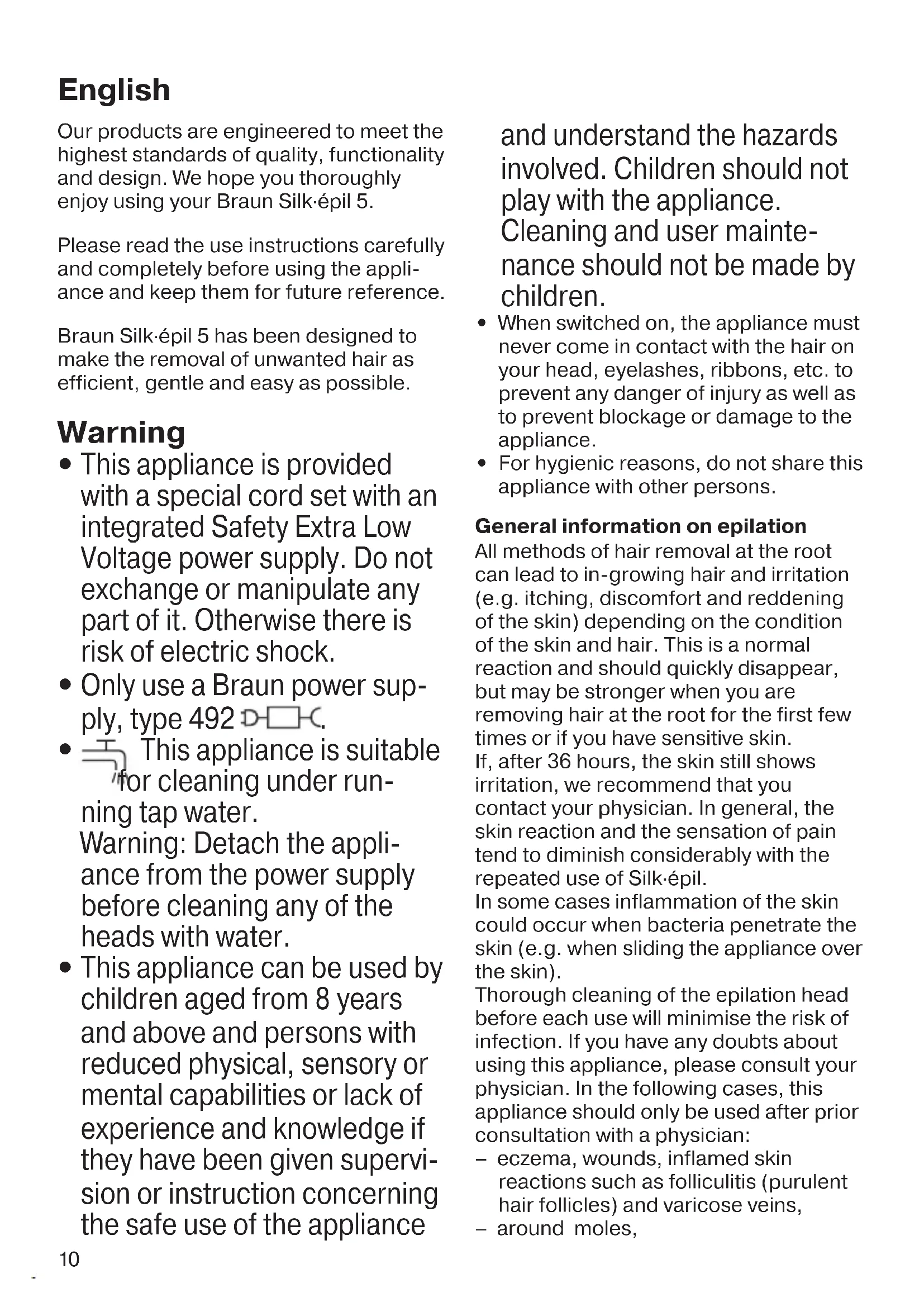 - If you are used to the sensation of epilation, you may replace the massage cap (1a) with the skin contact cap (1b) which provides a closer skin contact and an improved adaptation to all body areas. 3 Leg epilation Epilate your legs from the lower leg in an upward direction. When epilating 90340813_SE5_Power_MN.indd 1190340813_SE5_Power_MN.indd 11 02.06.22 10:4902.06.22 10:4912 behind the knee, keep the leg stretched out straight. 4 Underarm and bikini line epilation Please be aware that especially at the beginning, these areas are particularly sensitive to pain. Therefore, we recom- mend you start with switch setting «I». With repeated usage the pain sensa- tion will diminish. Before epilating, thoroughly clean the respective area to remove residues (like deodorant). Then carefully dab dry with a towel. When epilating the underarm, keep your arm raised up so that the skin is stretched and guide the appliance in different directions. As skin may be more sensitive directly after epilation, avoid using irritating substances such as deodorants with alcohol. 5 Cleaning the epilation head Before cleaning, unplug the appliance. Regular cleaning ensures better per- formance. a Brush cleaning: Remove the cap (1) and brush it out. Thoroughly clean the tweezers from the rear side of the epilator head with the brush dipped into alcohol. While doing so, turn the tweezer element manually. This cleaning method ensures best hygienic conditions for the epilation head. b Cleaning under running water: Remove the cap. Hold the appliance with the epilation head under running water. Then press the release button (5) to remove the epilation head (2). Thoroughly shake both, the epilation head and the appliance to make sure that remaining water can drip out. Leave both parts to dry. Before reat- taching, make sure that they are com- pletely dry. B How to use the shaver head The shaver head (7) is designed for a fast and close shave of legs, underarms and bikini line, contour trimming and cutting hair to 5 mm length. With the shaver head attached, use the appliance only on dry skin and with speed setting «II». a Shaving: select «