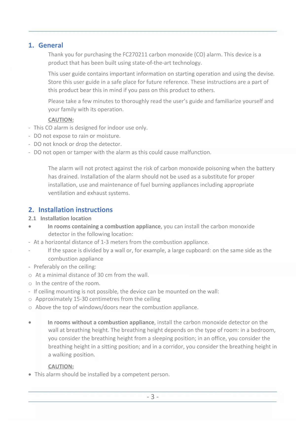 Thank you for purchasing the FC270211 carbon monoxide (CO) alarm. This device is a product that has been built using state-of-the-art technology. This user guide contains important information on starting operation and using the devise. Store this user guide in a safe place for future reference. These instructions are a part of this product bear this in mind if you pass on this product to others. Please take a few minutes to thoroughly read the user’s guide and familiarize yourself and your family with its operation. CAUTION: - This CO alarm is designed for indoor use only. - DO not expose to rain or moisture. - DO not knock or drop the detector. - DO not open or tamper with the alarm as this could cause malfunction. The alarm will not protect against the risk of carbon monoxide poisoning when the battery has drained. Installation of the alarm should not be used as a substitute for proper installation, use and maintenance of fuel burning appliances including appropriate ventilation and exhaust systems.