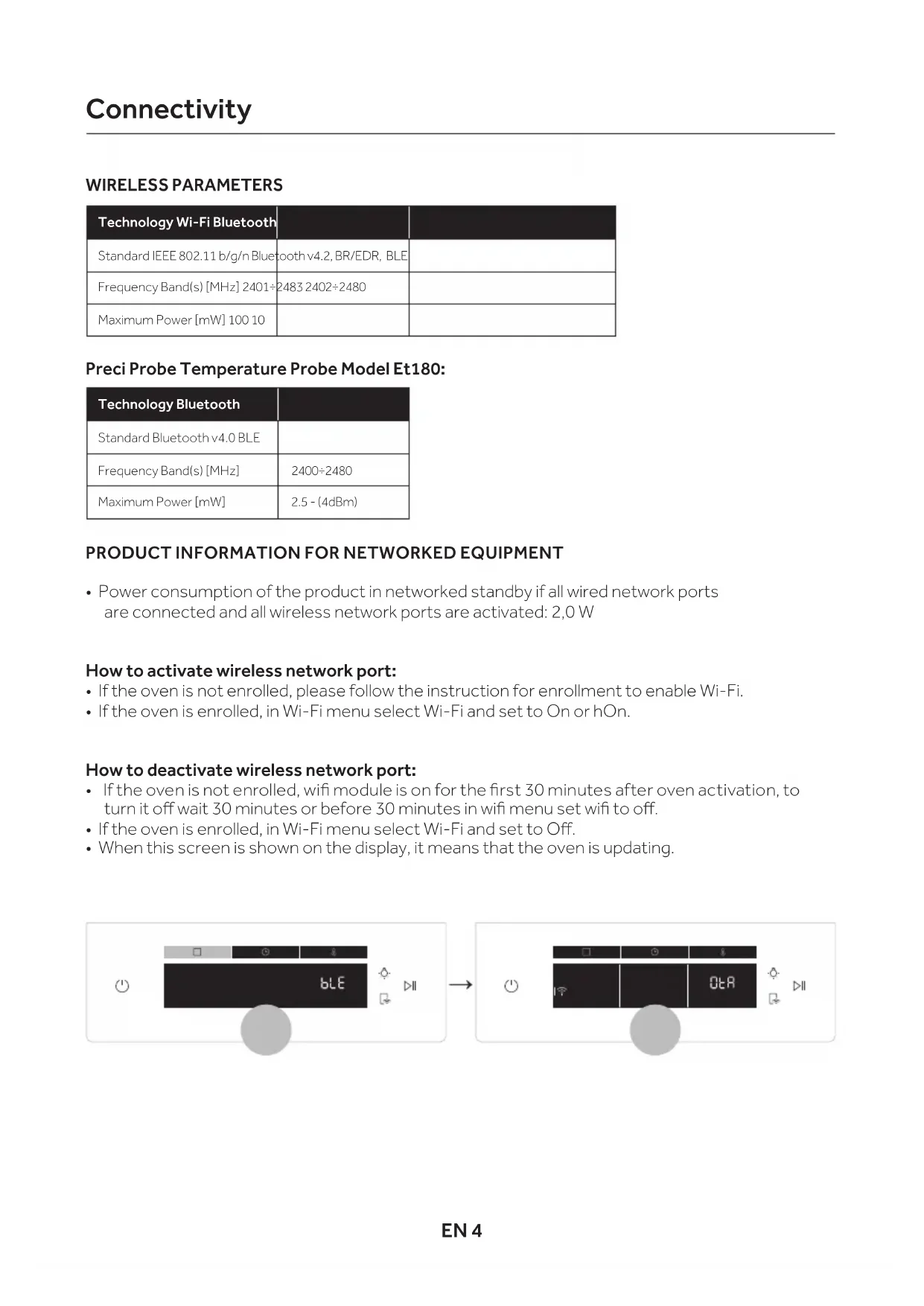 - When this screen is shown on the display, it means that the oven is updating. Preci Probe Temperature Probe Model Et180: Connectivity Technology Wi-Fi Bluetooth Standard IEEE 802.11 b/g/n Bluetooth v4.2, BR/EDR, BLE Frequency Band(s) [MHz] 2401÷2483 2402÷2480 Maximum Power [mW] 100 10 Technology Bluetooth Standard Bluetooth v4.0 BLE Frequency Band(s) [MHz] 2400÷2480 Maximum Power [mW] 2.5 - (4dBm)EN 5 Oven enrollment on app