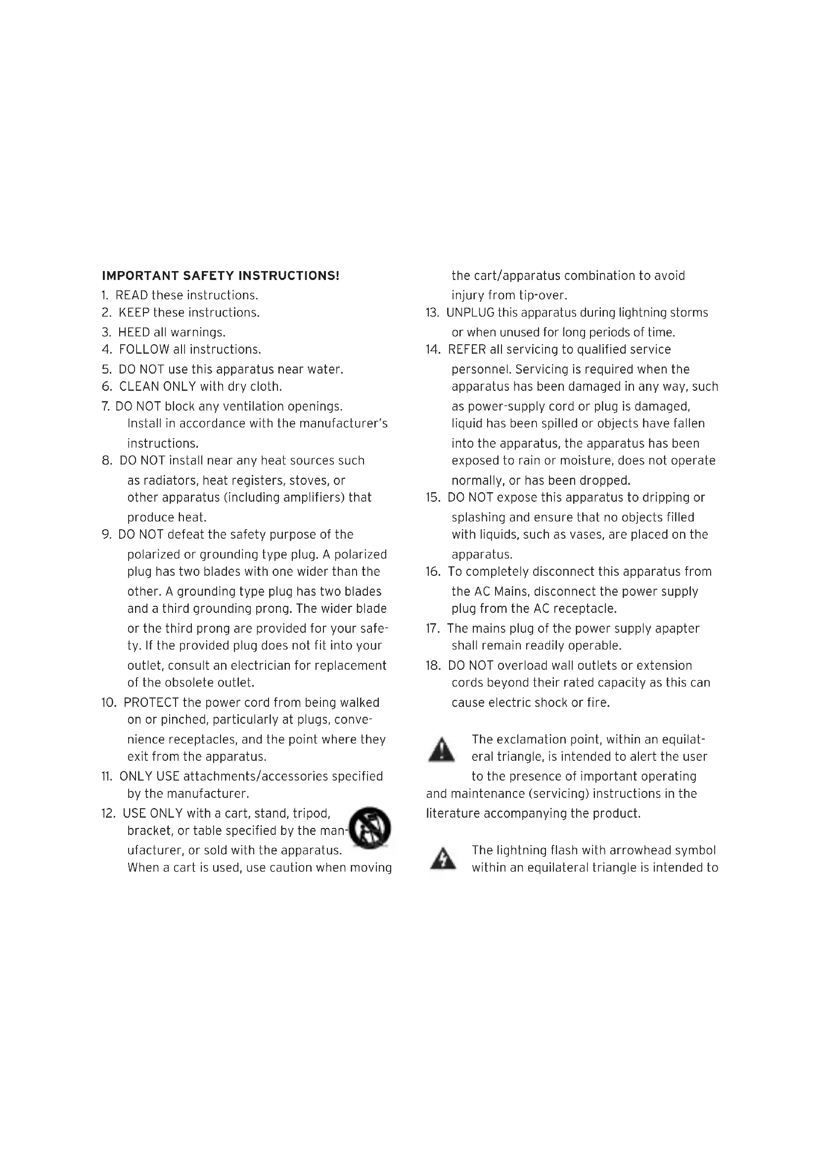 cords beyond their rated capacity as this can cause electric shock or fire. The exclamation point, within an equilat- eral triangle, is intended to alert the user to the presence of important operating and maintenance (servicing) instructions in the literature accompanying the product. The lightning flash with arrowhead symbol within an equilateral triangle is intended toalert the user to the presence of uninsulated “dan- gerous voltage” within the product’s enclosure that may be of sufficient magnitude to constitute a risk of electrical shock to persons.