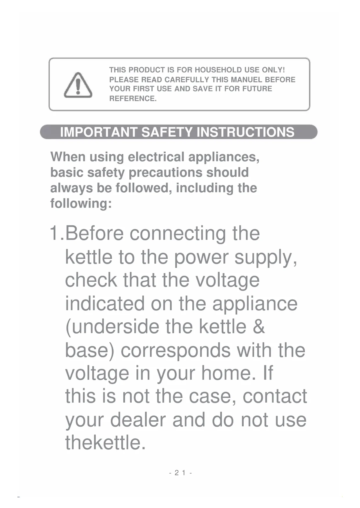 Before connecting the kettle to the power supply, check that the voltage indicated on the appliance (underside the kettle & base) corresponds with the voltage in your home. If this is not the case, contact your dealer and do not use the kettle. THIS PRODUCT IS FOR HOUSEHOLD USE ONLY!