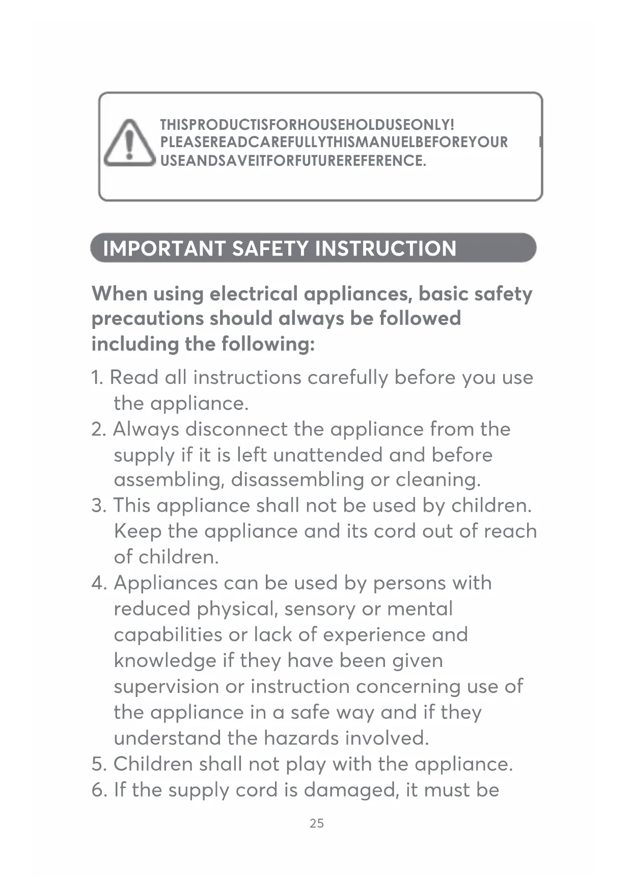 THIS PRODUCT IS FOR HOUSEHOLD USE ONLY! PLEASE READ CAREF ULLY THIS MANUEL BEFORE YOUR FIRST USE AND SAVE IT FOR FUTURE REFERENCE. When using electrical appliances, basic safety precautions should always be followed including the following: