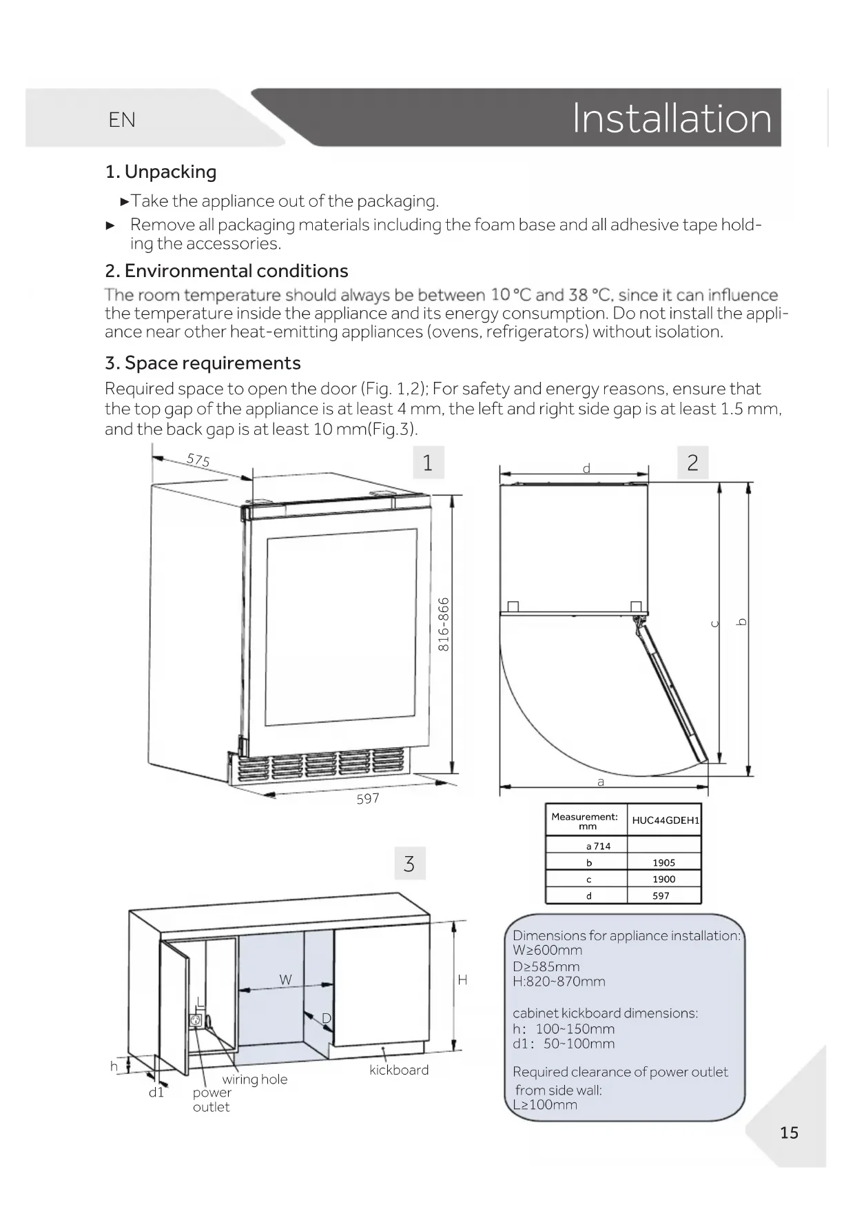 Required space to open the door (Fig. 1,2); For safety and energy reasons, ensure that the top gap of the appliance is at least 4 mm, the left and right side gap is at least 1.5 mm, and the back gap is at least 10 mm(Fig.3).EN Installation