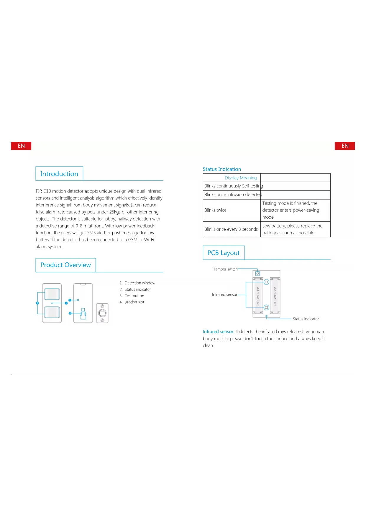 Status Indication Display Meaning Blinks continuously Self testing Blinks once Intrusion detected Blinks twice Testing mode is nished, the detector enters power-saving mode Blinks once every 3 seconds Low battery, please replace the battery as soon as possible PCB Layout Tamper switchInfrared sensorStatus indicator Infrared sensor: It detects the infrared rays released by human body motion, please don't touch the surface and always keep it clean.ENEN Tamper switch: Once the case is opened in working mode, the tamper switch is triggered and then generates an alarm signal. Detection Range