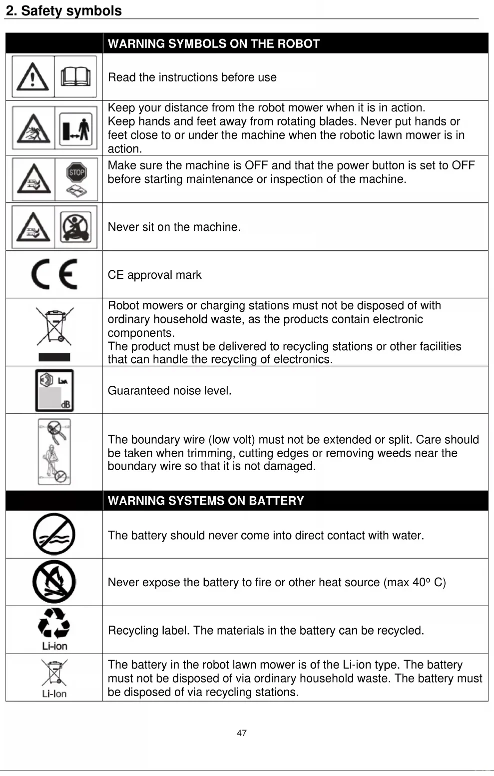 The battery in the robot lawn mower is of the Li-ion type. The battery must not be disposed of via ordinary household waste. The battery must be disposed of via recycling stations.48
