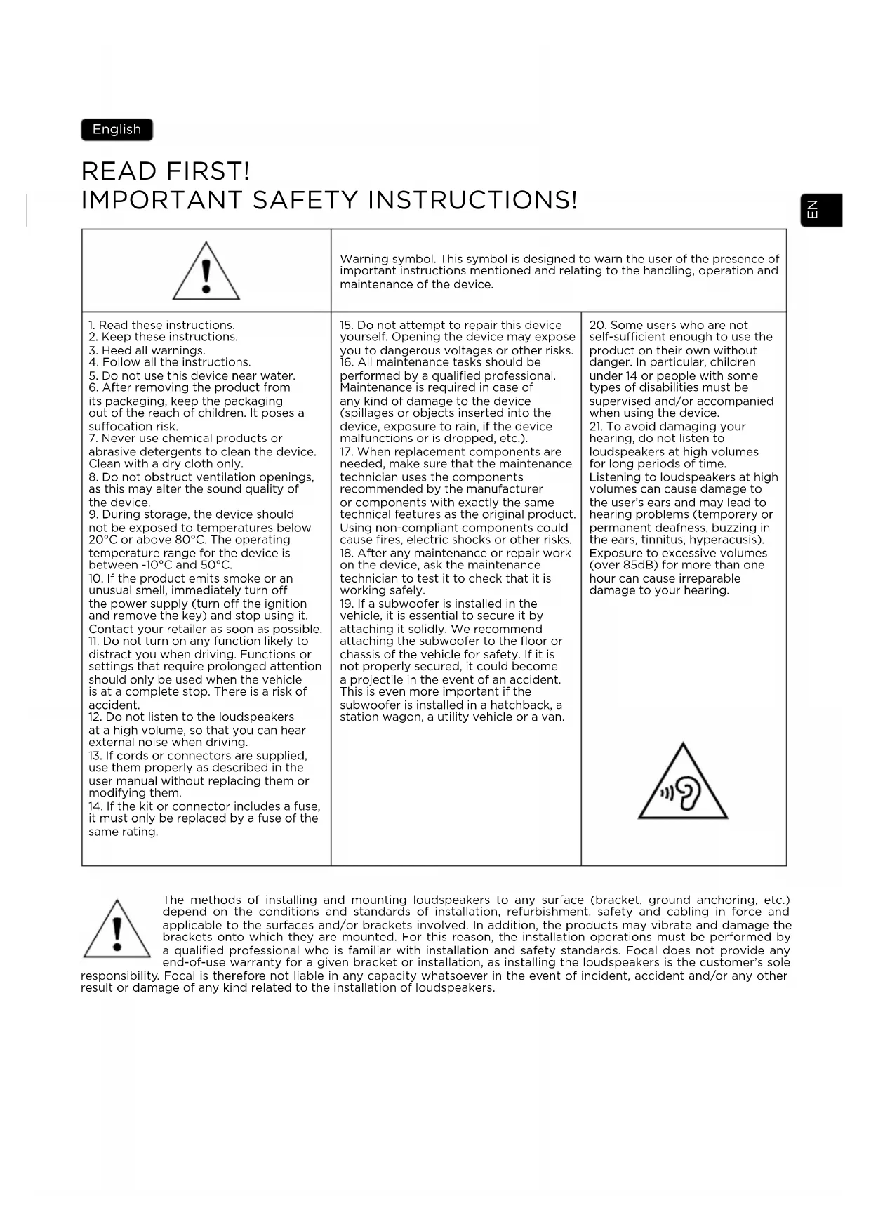hearing, do not listen to loudspeakers at high volumes for long periods of time. Listening to loudspeakers at high volumes can cause damage to the user’s ears and may lead to hearing problems (temporary or permanent deafness, buzzing in the ears, tinnitus, hyperacusis). Exposure to excessive volumes (over 85dB) for more than one hour can cause irreparable damage to your hearing. The methods of installing and mounting loudspeakers to any surface (bracket, ground anchoring, etc.) depend on the conditions and standards of installation, refurbishment, safety and cabling in force and applicable to the surfaces and/or brackets involved. In addition, the products may vibrate and damage the brackets onto which they are mounted. For this reason, the installation operations must be performed by a qualified professional who is familiar with installation and safety standards. Focal does not provide any end-of-use warranty for a given bracket or installation, as installing the loudspeakers is the customer’s sole responsibility. Focal is therefore not liable in any capacity whatsoever in the event of incident, accident and/or any other result or damage of any kind related to the installation of loudspeakers.