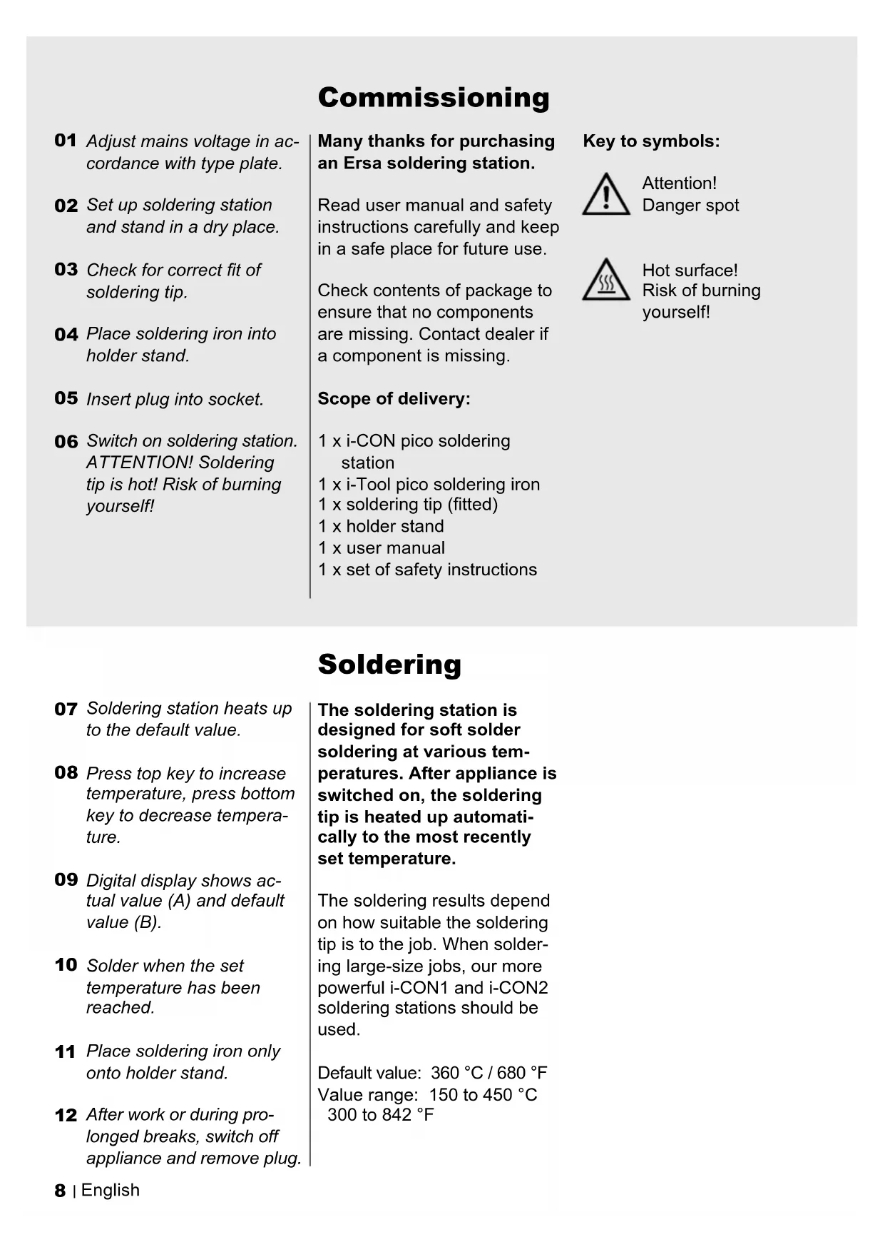 Switch on soldering station. ATTENTION! Soldering tip is hot! Risk of burning yourself! Key to symbols: Attention! Danger spot Hot surface! Risk of burning yourself! Many thanks for purchasing an Ersa soldering station. Read user manual and safety instructions carefully and keep in a safe place for future use. Check contents of package to ensure that no components are missing. Contact dealer if a component is missing. Scope of delivery: 1 x i-CON pico soldering station 1 x i-Tool pico soldering iron 1 x soldering tip (tted) 1 x holder stand 1 x user manual 1 x set of safety instructions Soldering