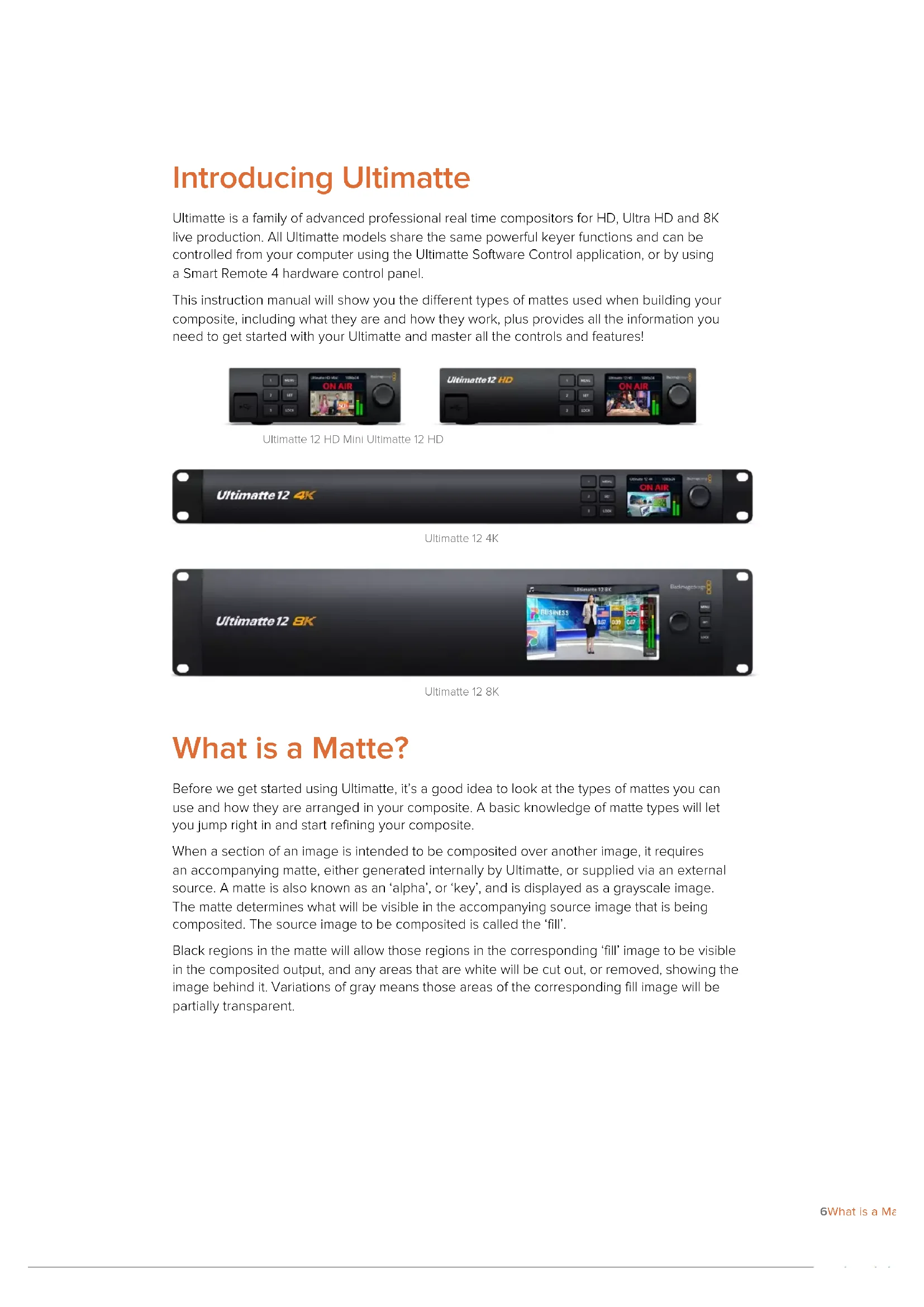 Ultimatte 12 Ultimatte 12 September 2022 Operations ManualLanguages To go directly to your preferred language, simply click on the hyperlinks listed in thecontents below. English 3 日本語 104 Français 206 Deutsch 308 Español 410 中文 512 한국어 614 Русский 716 Italiano 818 Português 920 Türkçe 1022Welcome Thank you for purchasing Blackmagic Ultimatte. Ultimatte has been the premiere keyer used in the film and television industries for decades and no other keyer comes close to the performance that Ultimatte can achieve. It’s powerful enough to handle fine detail on key edges as well as retaining stronger colors, even when those foreground colors are close to the key color. Even uneven green and blue screen backdrops can be handled. However, what makes Ultimatte so powerful is its ability to map shadows onto the new background layer combined with its color spill management that lets you create extremely realistic environments. In many ways, Ultimatte is much more than a keyer as it’s really a real time advanced compositor for creating photorealistic virtual environments. Ultimatte lets you move your talent to any location at the click of a button and the results look real. This instruction manual contains all the information you need to get started with Ultimatte as well as detailed instructions on how to operate Ultimatte using Blackmagic Ultimatte Software Control from your computer or Smart Remote 4. Also, please check the support page on our website at www.blackmagicdesign.com for the latest version of this manual and for updates to your Blackmagic Ultimatte’s software. Keeping your software up to date will ensure you get all the latest features! We are continually working on new features and improvements, so we would love to hear from you! Grant Petty CEO Blackmagic Design EnglishContents