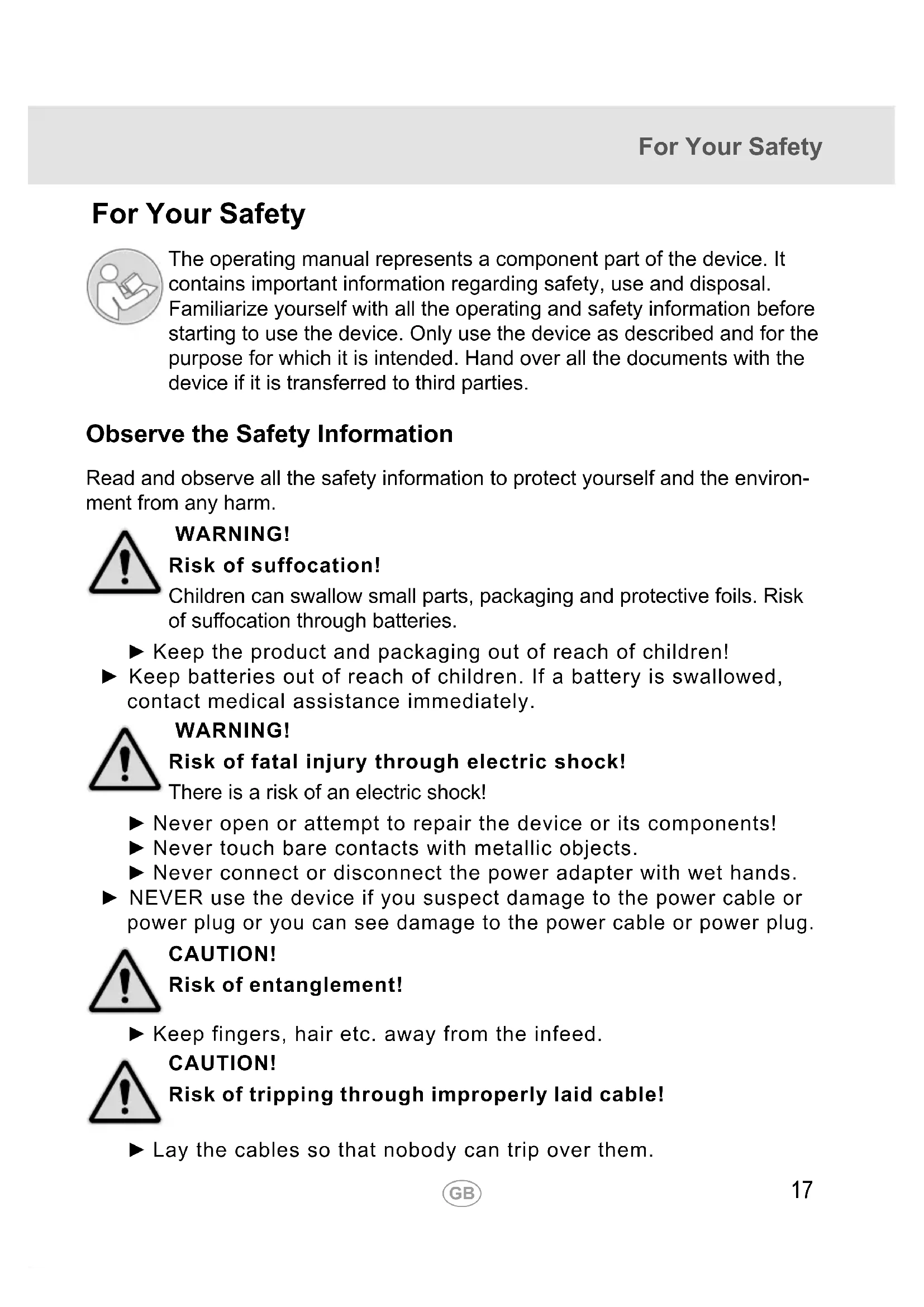 For Your Safety The operating manual represents a component part of the device. It contains important information regarding safety, use and disposal. Familiarize yourself with all the operating and safety information before starting to use the device. Only use the device as described and for the purpose for which it is intended. Hand over all the documents with the device if it is transferred to third parties. Observe the Safety Information Read and observe all the safety information to protect yourself and the environ- ment from any harm. WARNING! Risk of suffocation! Children can swallow small parts, packaging and protective foils. Risk of suocation through batteries. ► Keep the product and packaging out of reach of children! ► Keep batteries out of reach of children. If a battery is swallowed, contact medical assistance immediately. WARNING! Risk of fatal injury through electric shock! There is a risk of an electric shock! ► Never open or attempt to repair the device or its components! ► Never touch bare contacts with metallic objects. ► Never connect or disconnect the power adapter with wet hands. ► NEVER use the device if you suspect damage to the power cable or power plug or you can see damage to the power cable or power plug. CAUTION! Risk of entanglement! ► Keep fingers, hair etc. away from the infeed. CAUTION! Risk of tripping through improperly laid cable! ► Lay the cables so that nobody can trip over them.For Your Safety