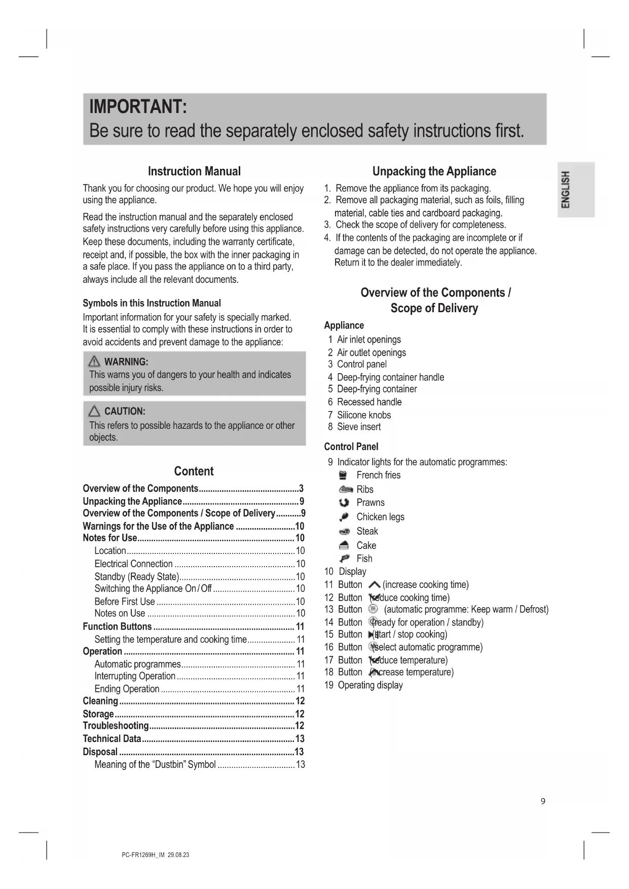 damage can be detected, do not operate the appliance. Return it to the dealer immediately. Overview of the Components / Scope of Delivery Appliance 1 Air inlet openings 2 Air outlet openings 3 Control panel 4 Deep-frying container handle 5 Deep-frying container 6 Recessed handle 7 Silicone knobs 8 Sieve insert Control Panel 9 Indicator lights for the automatic programmes: French fries Ribs Prawns Chicken legs Steak Cake Fish 10 Display 11 Button (increase cooking time) 12 Button (reduce cooking time) 13 Button (automatic programme: Keep warm / Defrost) 14 Button (ready for operation / standby) 15 Button (start / stop cooking) 16 Button (select automatic programme) 17 Button (reduce temperature) 18 Button (increase temperature) 19 Operating displayPC-FR1269H_IM 29.08.23