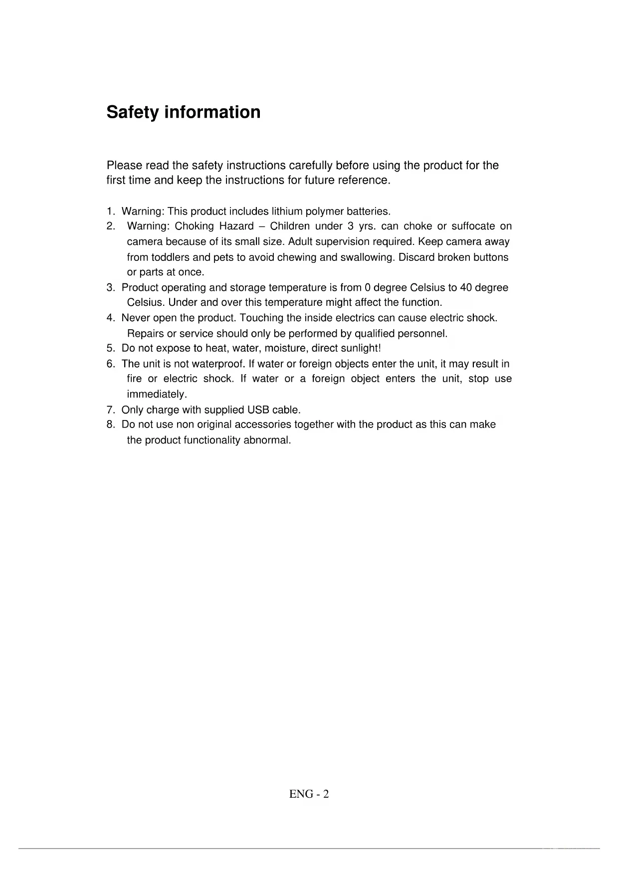 camera because of its small size. Adult supervision required. Keep camera away from toddlers and pets to avoid chewing and swallowing. Discard broken buttons or parts at once.