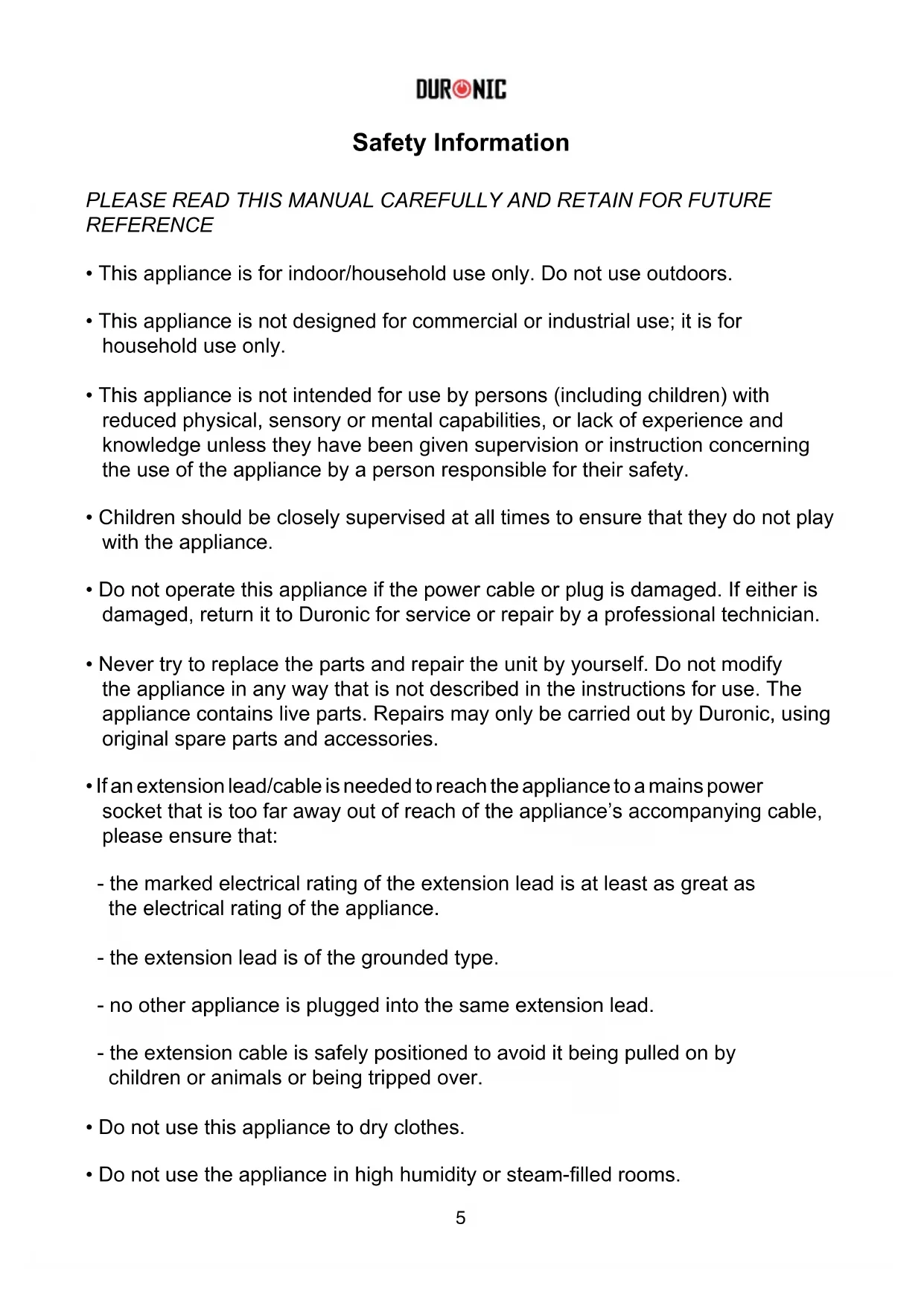 - Do not operate this appliance if the power cable or plug is damaged. If either is damaged, return it to Duronic for service or repair by a professional technician.