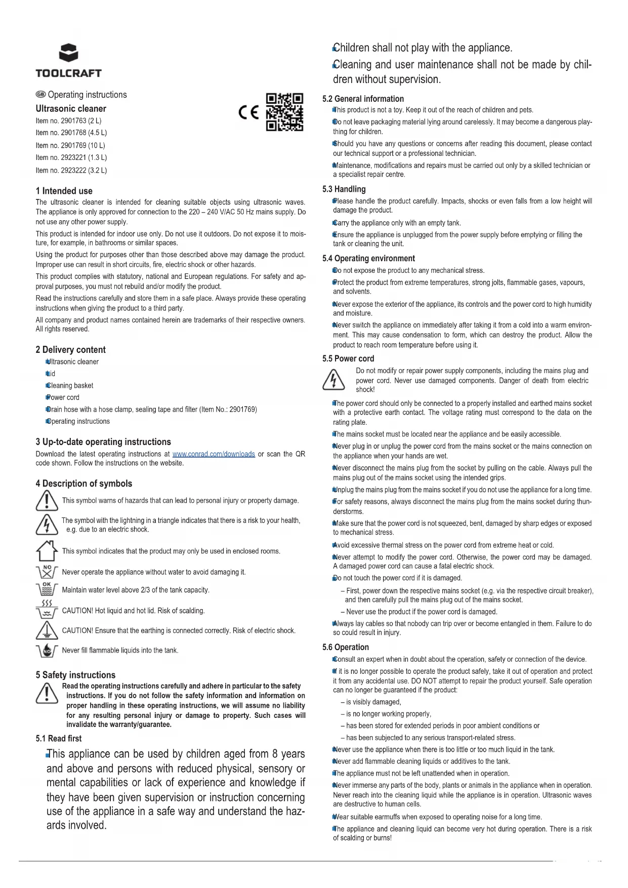 Betriebsspannung 220 - 240 V/AC 50 Hz Leistungsaufnahme (W) 160 380 440 160 280 Sicherung (Glasrohr 5 x 20 mm) F10 A/250 V Ultraschall-Leistung (W) 60 180 240 60 180 Ultraschall-Frequenz (kHz) 40 Heizleistung (W) 100 200 200 100 100 Timer (min) 0 - 30 Temperatureinstellung (°C) 30 - 80 Tankinhalt (l) 2 4,5 10 1,3 3,2 Abmessungen Tank (mm) 150 x 135 x 100 300 x 150 x 100 300 x 240 x 150 150 x 135 x 65 240 x 135 x 100 Abmessungen Gehäuse (mm) 175 x 160 x 210 325 x 180 x 225 325 x 265 x 280 172 x 162 x 165 265 x 165 x 220 Gewicht (kg) 2,4 4,6 7,3 2 3,6Operating instructions Ultrasonic cleaner Item no. 2901763 (2 L) Item no. 2901768 (4.5 L) Item no. 2901769 (10 L) Item no. 2923221 (1.3 L) Item no. 2923222 (3.2 L) 1 Intended use The ultrasonic cleaner is intended for cleaning suitable objects using ultrasonic waves. The appliance is only approved for connection to the 220 – 240 V/AC 50 Hz mains supply. Do not use any other power supply. This product is intended for indoor use only. Do not use it outdoors. Do not expose it to mois- ture, for example, in bathrooms or similar spaces. Using the product for purposes other than those described above may damage the product. Improper use can result in short circuits, re, electric shock or other hazards. This product complies with statutory, national and European regulations. For safety and ap- proval purposes, you must not rebuild and/or modify the product. Read the instructions carefully and store them in a safe place. Always provide these operating instructions when giving the product to a third party. All company and product names contained herein are trademarks of their respective owners. All rights reserved. 2 Delivery content