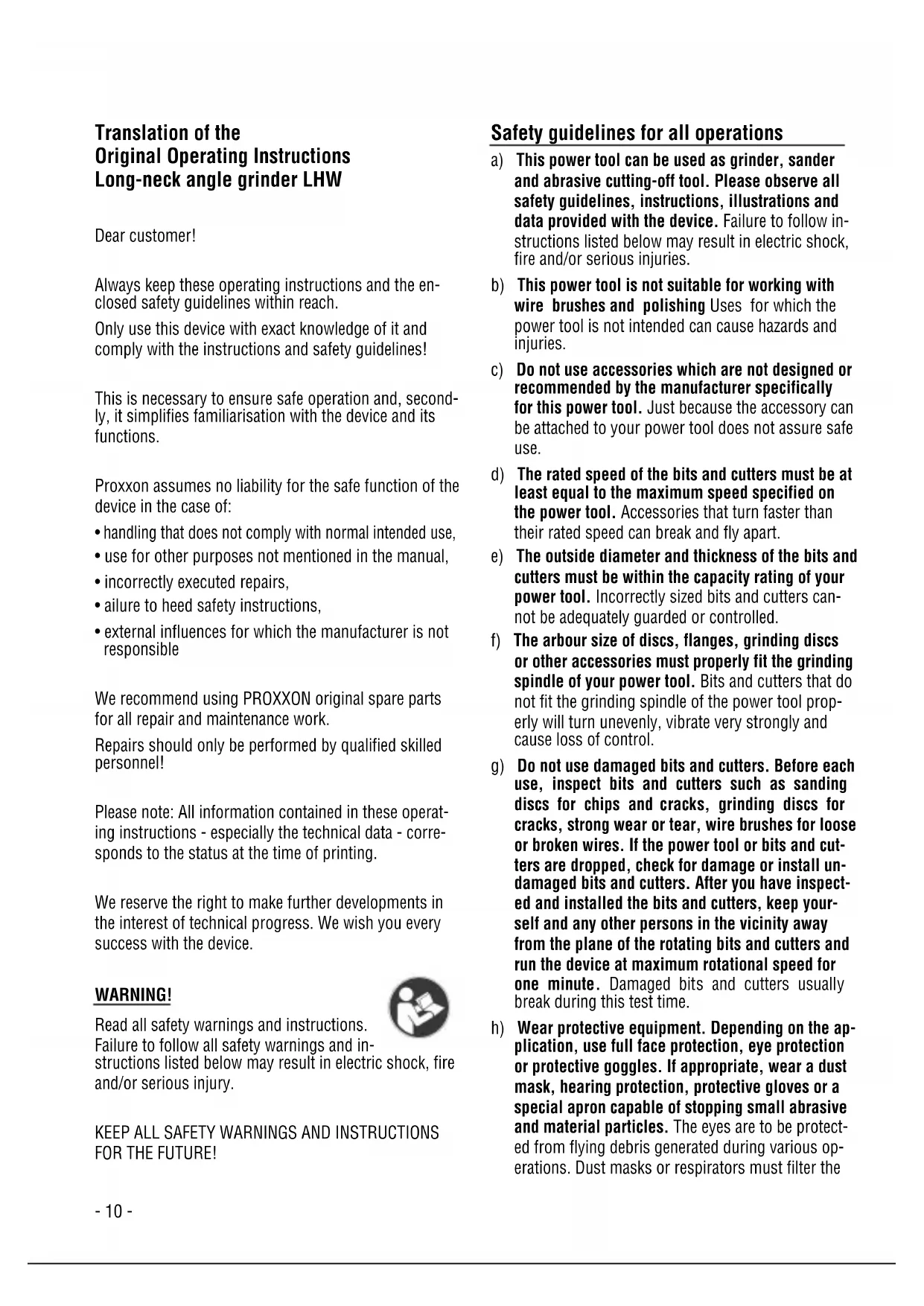 - external influences for which the manufacturer is not responsible We recommend using PROXXON original spare parts for all repair and maintenance work. Repairs should only be performed by qualified skilled personnel! Please note: All information contained in these operat- ing instructions - especially the technical data - corre- sponds to the status at the time of printing. We reserve the right to make further developments in the interest of technical progress. We wish you every success with the device. WARNING! Read all safety warnings and instructions. Failure to follow all safety warnings and in- structions listed below may result in electric shock, fire and/or serious injury.