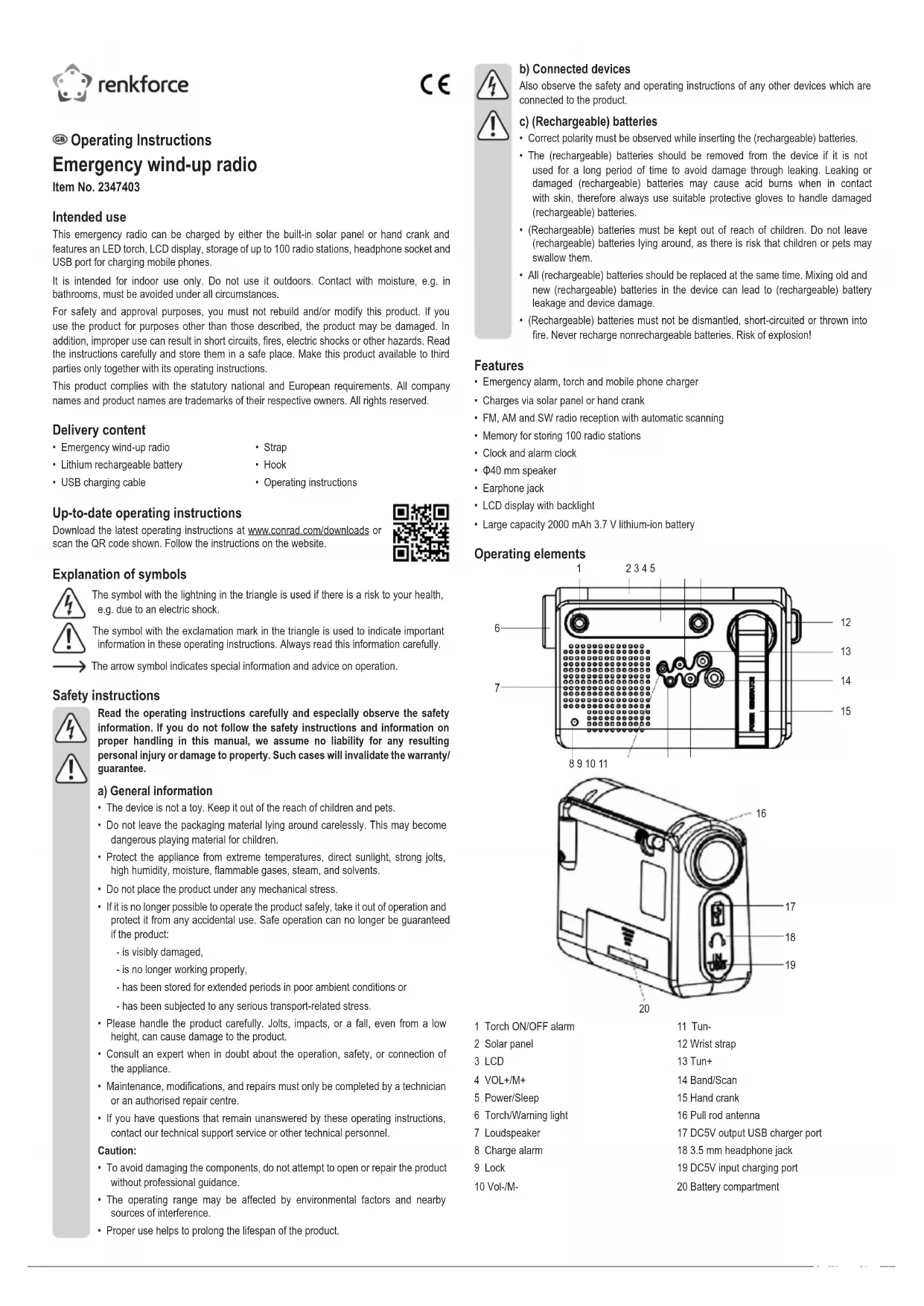 1 Torch ON/OFF alarm 2 Solar panel 3 LCD 4 VOL+/M+ 5 Power/Sleep 6 Torch/Warning light 7 Loudspeaker 8 Charge alarm 9 Lock 10 Vol-/M- 11 Tun- 12 Wrist strap 13 Tun+ 14 Band/Scan 15 Hand crank 16 Pull rod antenna 17 DC5V output USB charger port 18 3.5 mm headphone jack 19 DC5V input charging port 20 Battery compartment Operating Instructions Emergency wind-up radio Item No. 2347403 Intended use This emergency radio can be charged by either the built-in solar panel or hand crank and features an LED torch, LCD display, storage of up to 100 radio stations, headphone socket and USB port for charging mobile phones. It is intended for indoor use only. Do not use it outdoors. Contact with moisture, e.g. in bathrooms, must be avoided under all circumstances. For safety and approval purposes, you must not rebuild and/or modify this product. If you use the product for purposes other than those described, the product may be damaged. In addition, improper use can result in short circuits, res, electric shocks or other hazards. Read the instructions carefully and store them in a safe place. Make this product available to third parties only together with its operating instructions. This product complies with the statutory national and European requirements. All company names and product names are trademarks of their respective owners. All rights reserved. Delivery content