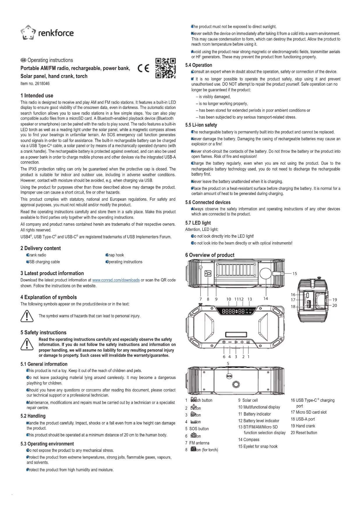 charging port 17 Micro SD card slot 18 USB-A port 19 Hand crank 20 Reset button Operating instructions Portable AM/FM radio, rechargeable, power bank, Solar panel, hand crank, torch Item no. 2618046 1 Intended use This radio is designed to receive and play AM and FM radio stations. It features a built-in LED display to ensure good visibility of the onscreen data, even in darkness. The automatic station search function allows you to save radio stations in a few simple steps. You can also play compatible audio les from a microSD card. A Bluetooth-enabled playback device (Bluetooth speaker or smartphone) can be paired with the radio to play sound. The radio features a built-in LED torch as well as a reading light under the solar panel, while a magnetic compass allows you to nd your bearings in unfamiliar terrain. An SOS emergency call function generates sound signals in order to call for assistance. The built-in rechargeable battery can be charged via a USB Type-C