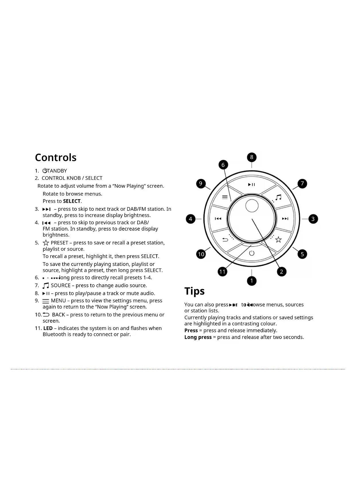 Bluetooth is ready to connect or pair. Tips You can also press or to browse menus, sources or station lists. Currently playing tracks and stations or saved settings are highlighted in a contrasting colour. Press = press and release immediately. Long press = press and release after two seconds.
