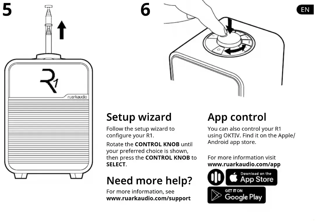 Setup wizard Follow the setup wizard to congure your R1. Rotate the CONTROL KNOB until your preferred choice is shown, then press the CONTROL KNOB to SELECT. Need more help? For more information, see www.ruarkaudio.com/support App control You can also control your R1 using OKTIV. Find it on the Apple/ Android app store. For more information visit www.ruarkaudio.com/appControls
