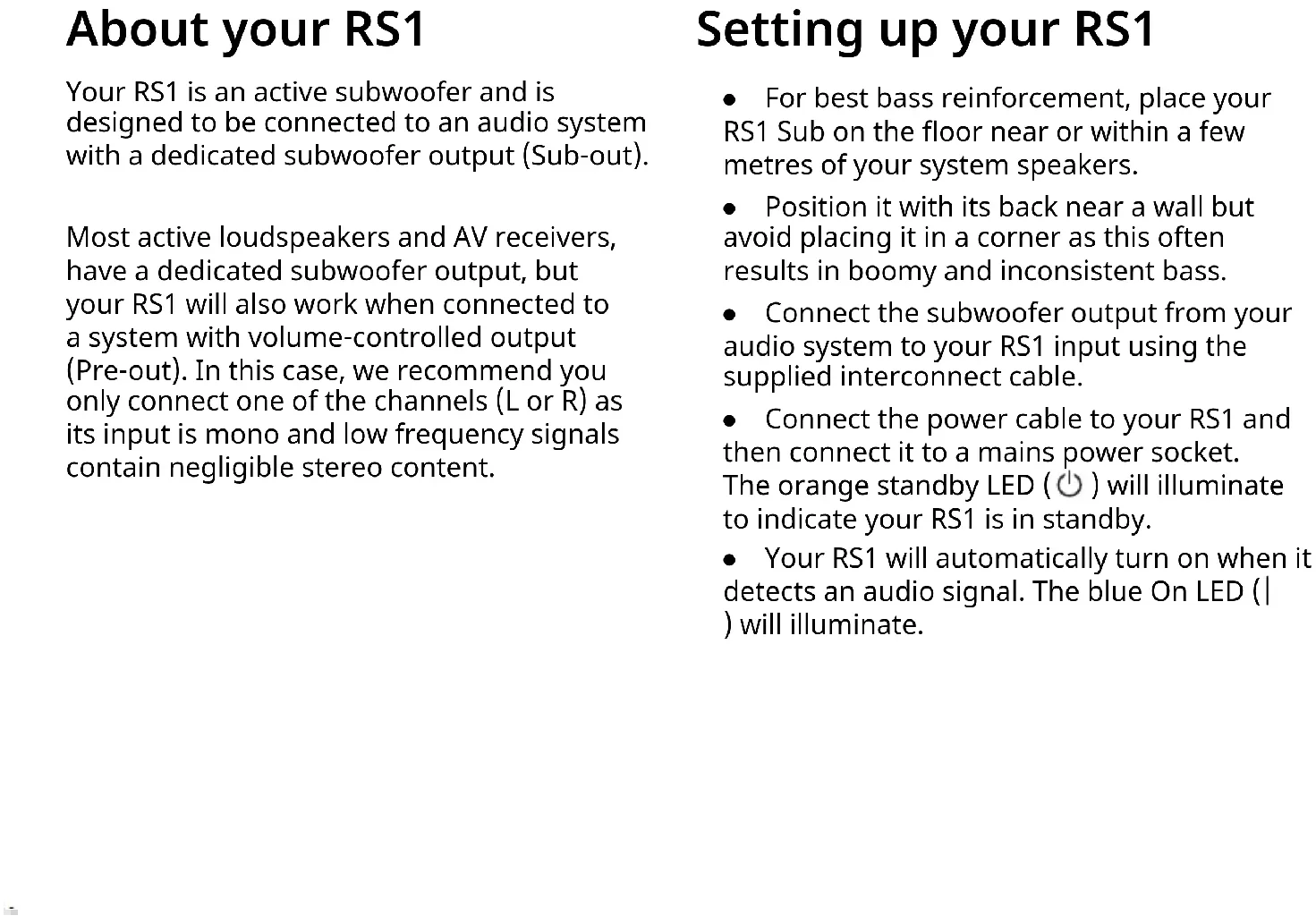 Your RS1 is an active subwoofer and is designed to be connected to an audio system with a dedicated subwoofer output (Sub-out). Most active loudspeakers and AV receivers, have a dedicated subwoofer output, but your RS1 will also work when connected to a system with volume-controlled output (Pre-out). In this case, we recommend you only connect one of the channels (L or R) as its input is mono and low frequency signals contain negligible stereo content. Setting up your RS1 ● For best bass reinforcement, place your RS1 Sub on the oor near or within a few metres of your system speakers. ● Position it with its back near a wall but avoid placing it in a corner as this often results in boomy and inconsistent bass. ● Connect the subwoofer output from your audio system to your RS1 input using the supplied interconnect cable. ● Connect the power cable to your RS1 and then connect it to a mains power socket. The orange standby LED ( ) will illuminate to indicate your RS1 is in standby. ● Your RS1 will automatically turn on when it detects an audio signal. The blue On LED ( ) will illuminate.EN
