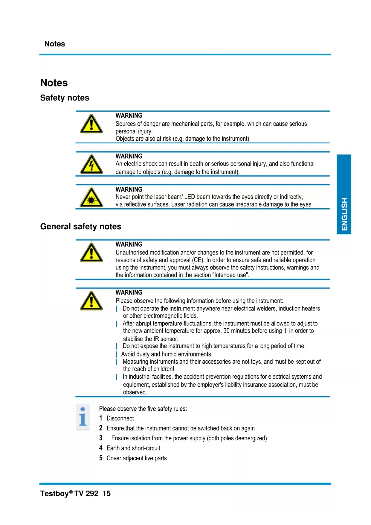 Please observe the five safety rules: 1 Disconnect 2 Ensure that the instrument cannot be switched back on again 3 Ensure isolation from the power supply (both poles deenergized) 4 Earth and short-circuit 5 Cover adjacent live partsNotes 16 Testboy