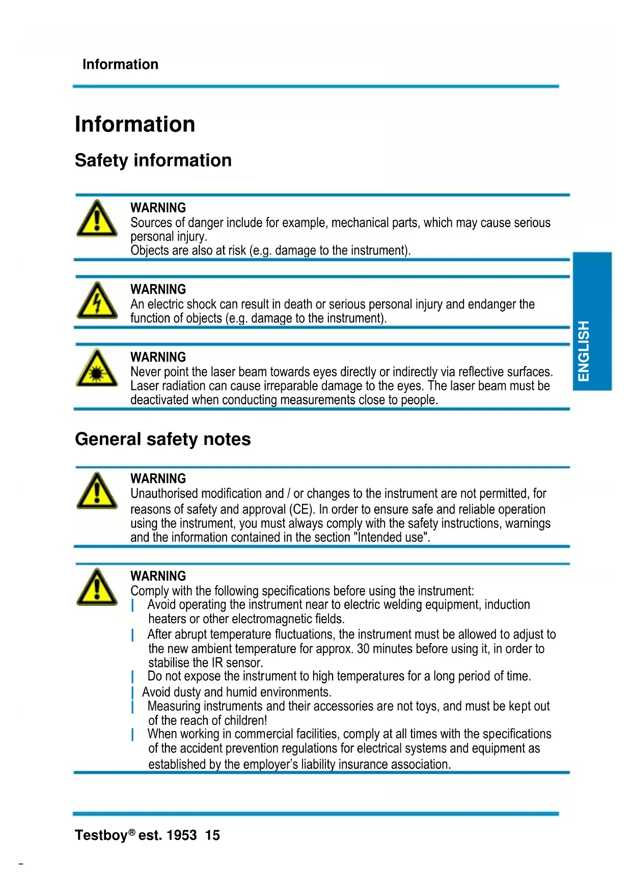 WARNING Comply with the following specifications before using the instrument: | Avoid operating the instrument near to electric welding equipment, induction heaters or other electromagnetic fields. | After abrupt temperature fluctuations, the instrument must be allowed to adjust to the new ambient temperature for approx. 30 minutes before using it, in order to stabilise the IR sensor. | Do not expose the instrument to high temperatures for a long period of time. | Avoid dusty and humid environments. | Measuring instruments and their accessories are not toys, and must be kept out of the reach of children! | When working in commercial facilities, comply at all times with the specifications of the accident prevention regulations for electrical systems and equipment as established by the employer’s liability insurance association.Information 16 Testboy