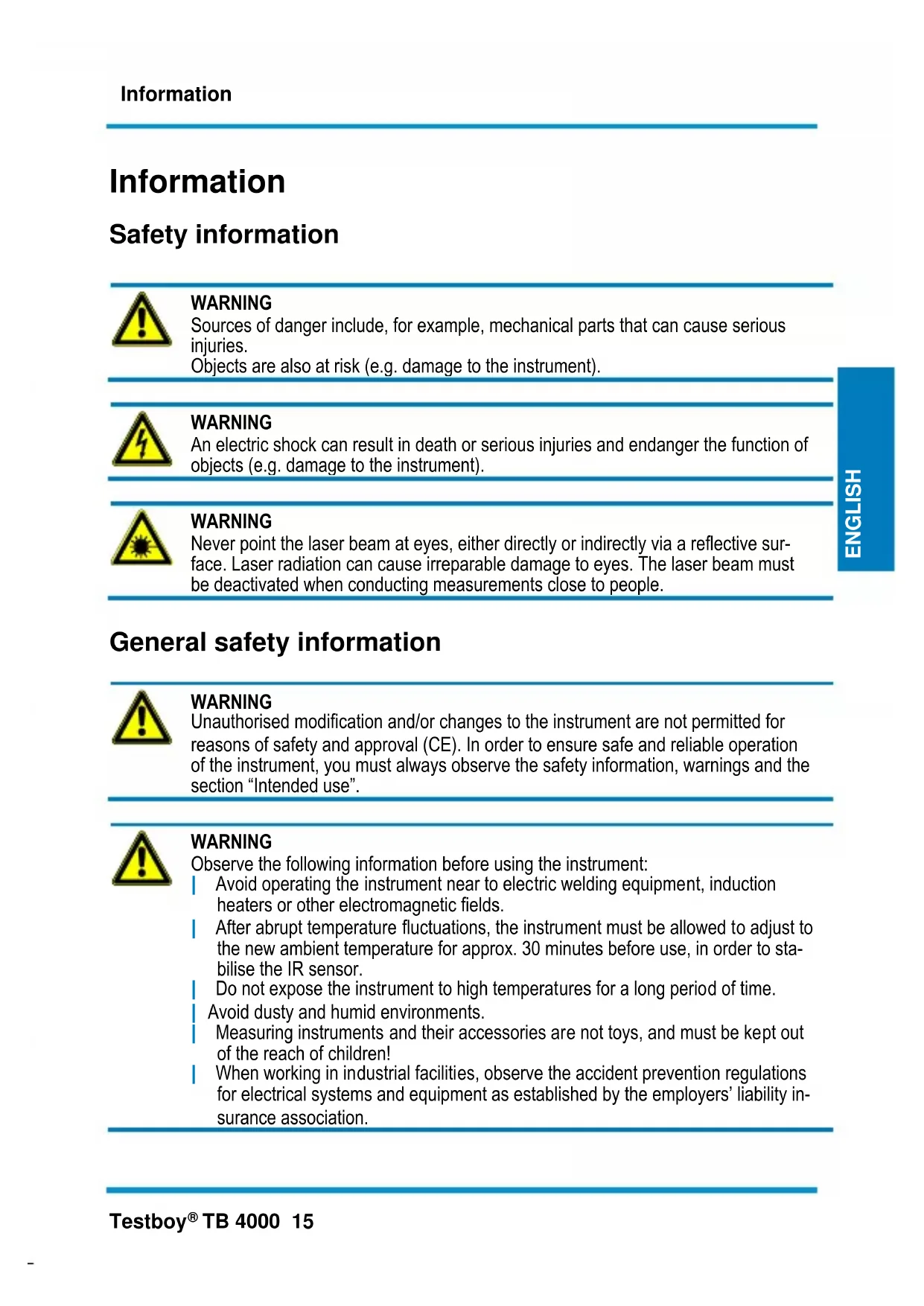 WARNING Observe the following information before using the instrument: | Avoid operating the instrument near to electric welding equipment, induction heaters or other electromagnetic fields. | After abrupt temperature fluctuations, the instrument must be allowed to adjust to the new ambient temperature for approx. 30 minutes before use, in order to sta- bilise the IR sensor. | Do not expose the instrument to high temperatures for a long period of time. | Avoid dusty and humid environments. | Measuring instruments and their accessories are not toys, and must be kept out of the reach of children! | When working in industrial facilities, observe the accident prevention regulations for electrical systems and equipment as established by the employers’ liability in- surance association.Information 16 Testboy