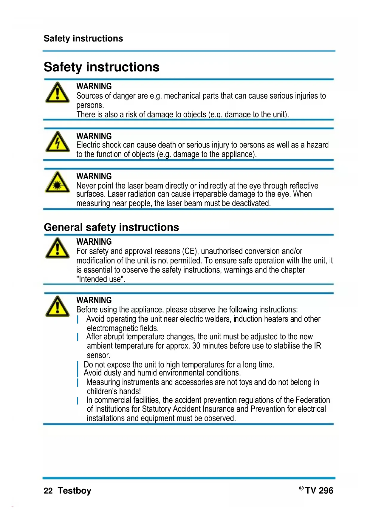 WARNING Before using the appliance, please observe the following instructions: | Avoid operating the unit near electric welders, induction heaters and other electromagnetic fields. | After abrupt temperature changes, the unit must be adjusted to the new ambient temperature for approx. 30 minutes before use to stabilise the IR sensor. | Do not expose the unit to high temperatures for a long time. | Avoid dusty and humid environmental conditions. | Measuring instruments and accessories are not toys and do not belong in children's hands! | In commercial facilities, the accident prevention regulations of the Federation of Institutions for Statutory Accident Insurance and Prevention for electrical installations and equipment must be observed.Safety instructions Testboy