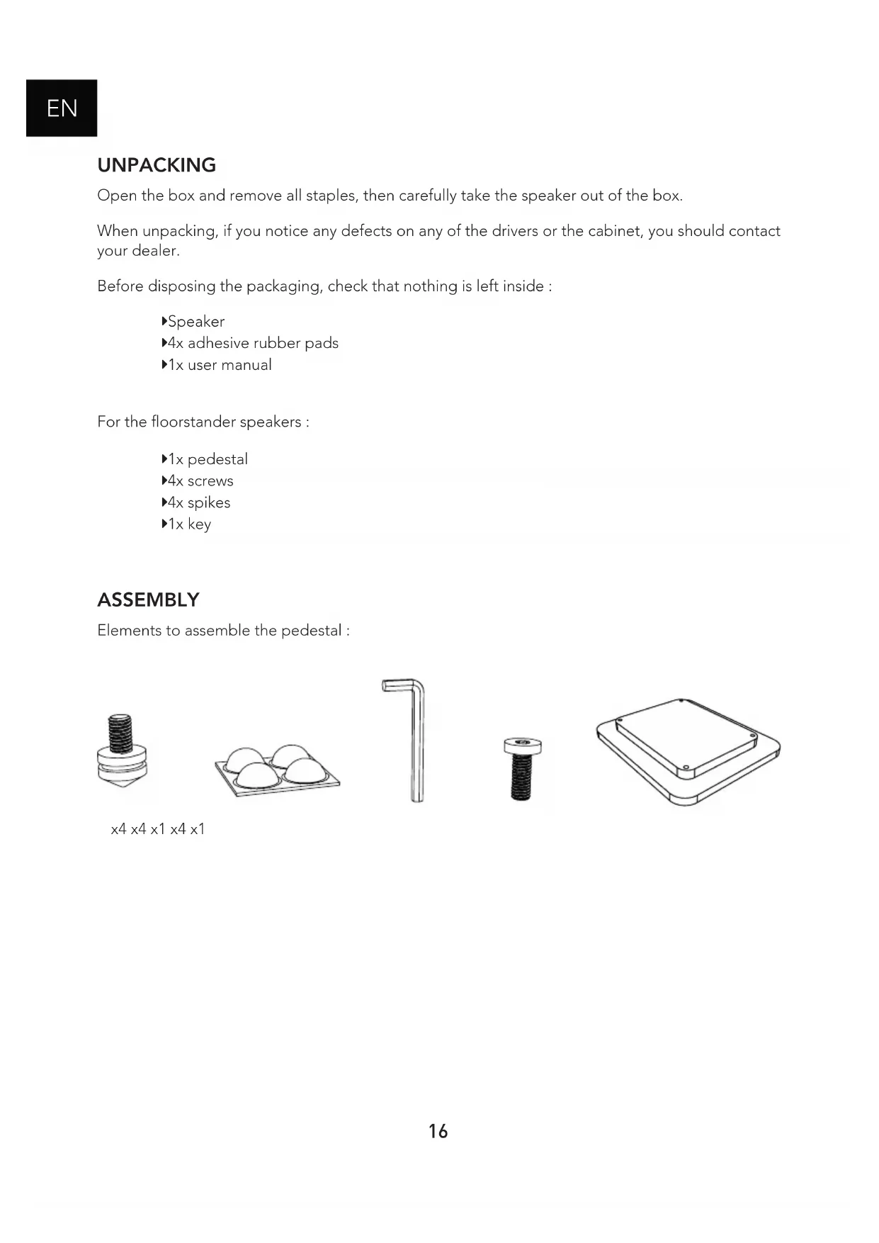 UNPACKING Open the box and remove all staples, then carefully take the speaker out of the box. When unpacking, if you notice any defects on any of the drivers or the cabinet, you should contact your dealer. Before disposing the packaging, check that nothing is left inside : Î Speaker Î 4x adhesive rubber pads Î 1x user manual For the oorstander speakers : Î 1x pedestal Î 4x screws Î 4x spikes Î 1x key ASSEMBLY Elements to assemble the pedestal : x4 x4 x1 x4 x117