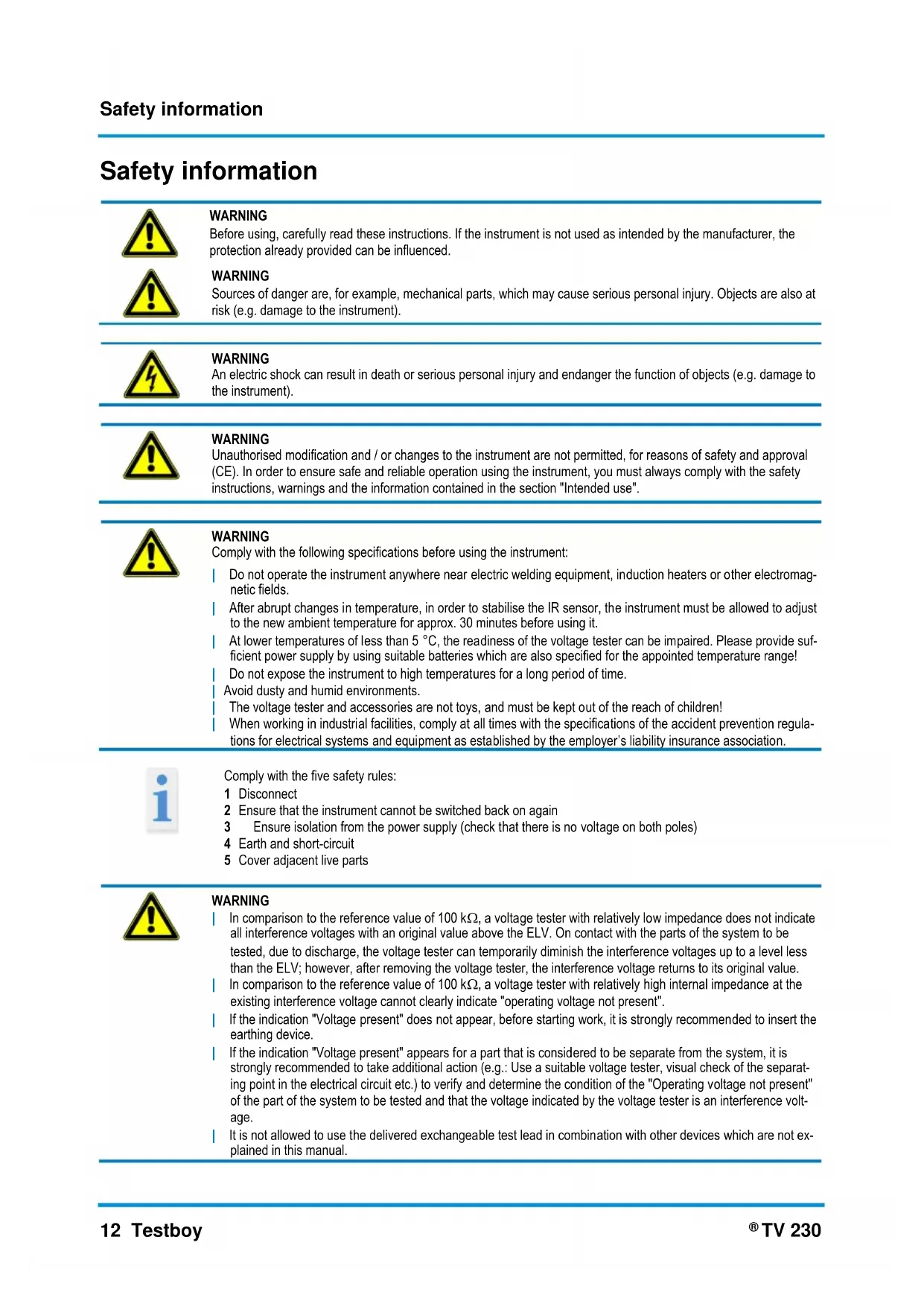 WARNING | In comparison to the reference value of 100 k, a voltage tester with relatively low impedance does not indicate all interference voltages with an original value above the ELV. On contact with the parts of the system to be tested, due to discharge, the voltage tester can temporarily diminish the interference voltages up to a level less than the ELV; however, after removing the voltage tester, the interference voltage returns to its original value. | In comparison to the reference value of 100 k, a voltage tester with relatively high internal impedance at the existing interference voltage cannot clearly indicate "operating voltage not present". | If the indication "Voltage present" does not appear, before starting work, it is strongly recommended to insert the earthing device. | If the indication "Voltage present" appears for a part that is considered to be separate from the system, it is strongly recommended to take additional action (e.g.: Use a suitable voltage tester, visual check of the separat- ing point in the electrical circuit etc.) to verify and determine the condition of the "Operating voltage not present" of the part of the system to be tested and that the voltage indicated by the voltage tester is an interference volt- age. | It is not allowed to use the delivered exchangeable test lead in combination with other devices which are not ex- plained in this manual.Safety information Testboy