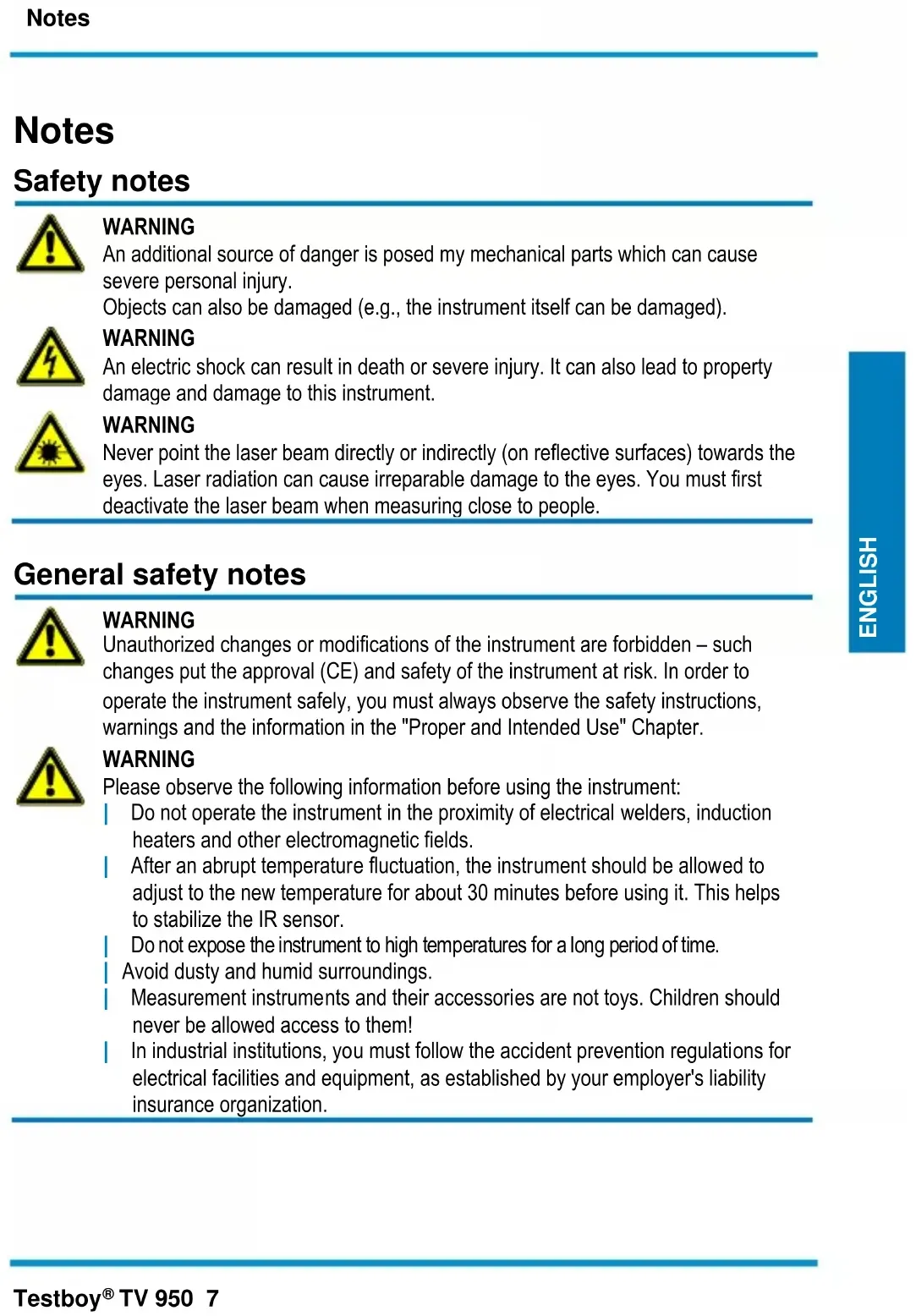 WARNING Please observe the following information before using the instrument: | Do not operate the instrument in the proximity of electrical welders, induction heaters and other electromagnetic fields. | After an abrupt temperature fluctuation, the instrument should be allowed to adjust to the new temperature for about 30 minutes before using it. This helps to stabilize the IR sensor. | Do not expose the instrument to high temperatures for a long period of time. | Avoid dusty and humid surroundings. | Measurement instruments and their accessories are not toys. Children should never be allowed access to them! | In industrial institutions, you must follow the accident prevention regulations for electrical facilities and equipment, as established by your employer's liability insurance organization.Notes 8 Testboy