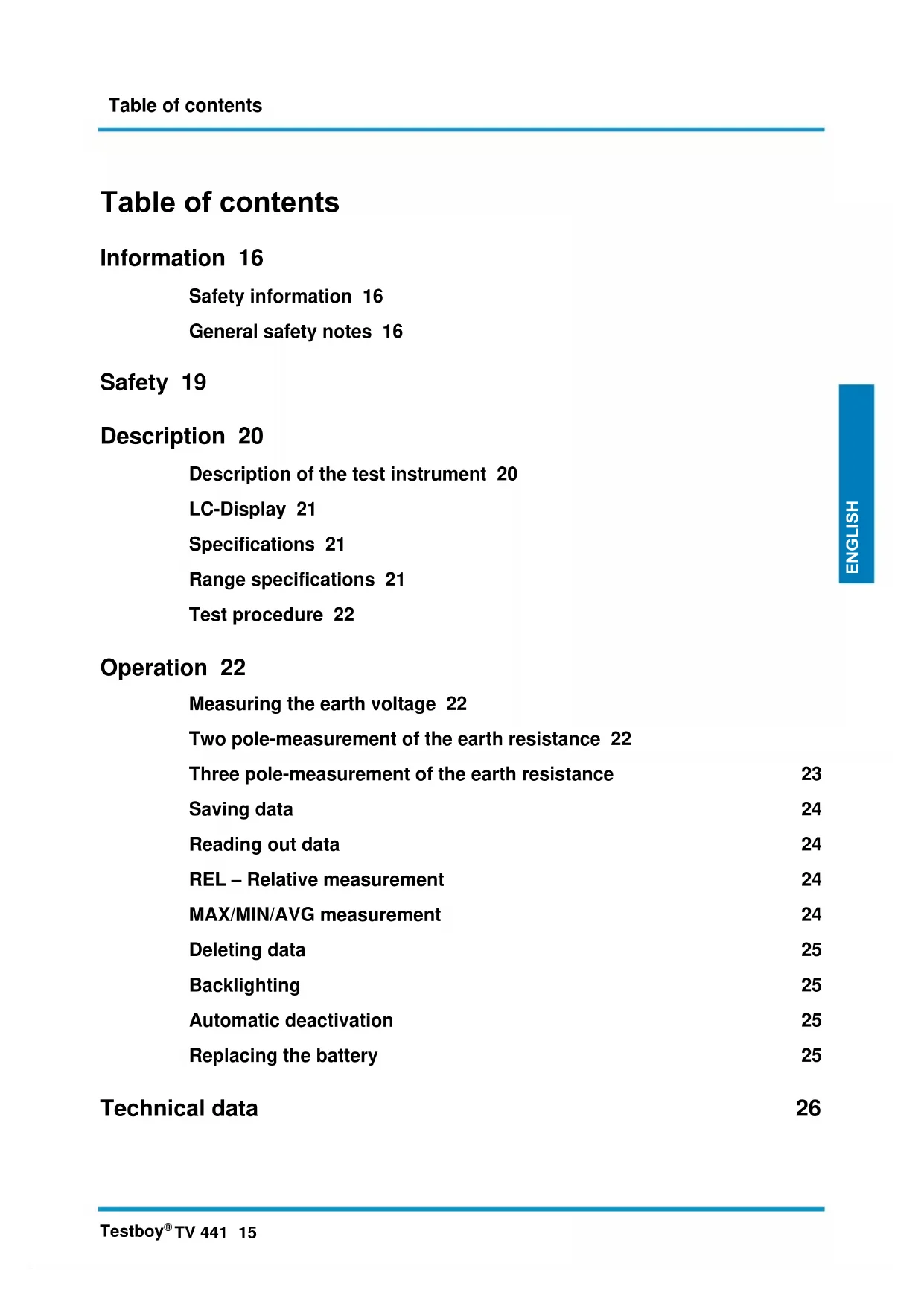 TV 441 15 ENGLISH Table of contents Information 16 Safety information 16 General safety notes 16 Safety 19 Description 20 Description of the test instrument 20 LC-Display 21 Specifications 21 Range specifications 21 Test procedure 22 Operation 22 Measuring the earth voltage 22 Two pole-measurement of the earth resistance 22 Three pole-measurement of the earth resistance 23 Saving data 24 Reading out data 24 REL – Relative measurement 24 MAX/MIN/AVG measurement 24 Deleting data 25 Backlighting 25 Automatic deactivation 25 Replacing the battery 25 Technical data 26Information 16 Testboy