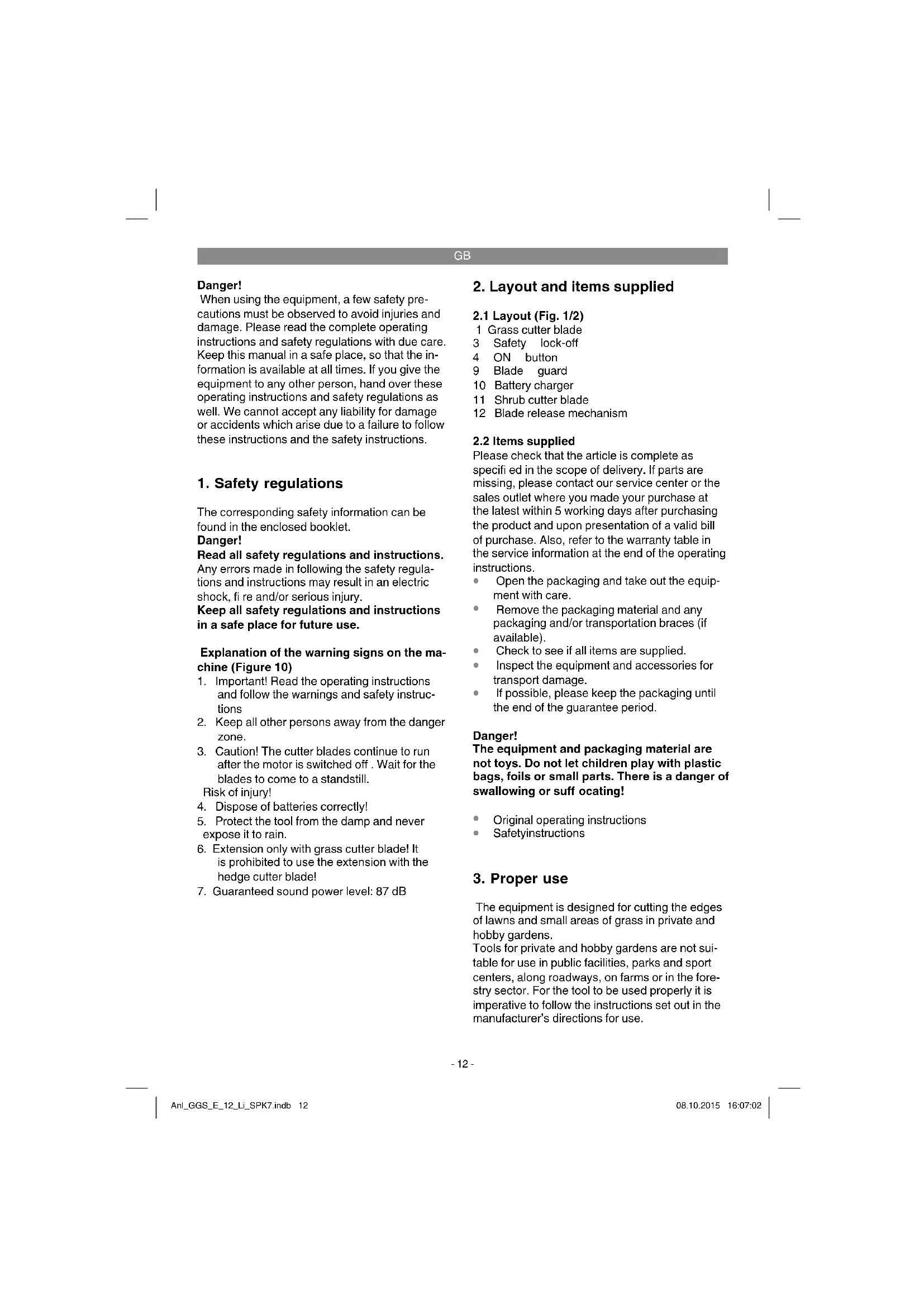 The equipment is designed for cutting the edges of lawns and small areas of grass in private and hobby gardens. Tools for private and hobby gardens are not sui- table for use in public facilities, parks and sport centers, along roadways, on farms or in the fore- stry sector. For the tool to be used properly it is imperative to follow the instructions set out in the manufacturer’s directions for use. Anl_GGS_E_12_Li_SPK7.indb 12Anl_GGS_E_12_Li_SPK7.indb 12 08.10.2015 16:07:0208.10.2015 16:07:02GB
