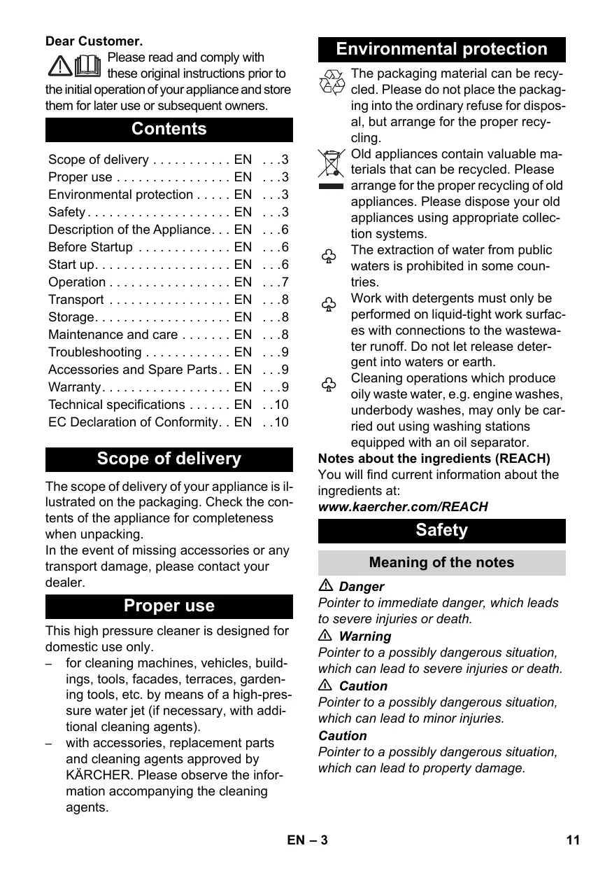Head of Approbation Dear Customer. Please read and comply with these original instructions prior to the initial operation of your appliance and store them for later use or subsequent owners. Scope of delivery The scope of delivery of your appliance is illustrated on the packaging. Check the contents of the appliance for completeness when unpacking. In the event of missing accessories or any transport damage, please contact your dealer. Proper use This high pressure cleaner is designed for domestic use only. – for cleaning machines, vehicles, buildings, tools, facades, terraces, gardening tools, etc. by means of a high-pressure water jet (if necessary, with additional cleaning agents). – with accessories, replacement parts and cleaning agents approved by KÄRCHER. Please observe the information accompanying the cleaning agents. Environmental protection The packaging material can be recycled. Please do not place the packaging into the ordinary refuse for disposal, but arrange for the proper recycling. Old appliances contain valuable materials that can be recycled. Please arrange for the proper recycling of old appliances. Please dispose your old appliances using appropriate collection systems. The extraction of water from public waters is prohibited in some countries. Work with detergents must only be performed on liquid-tight work surfaces with connections to the wastewater runoff. Do not let release detergent into waters or earth. Cleaning operations which produce oily waste water, e.g. engine washes, underbody washes, may only be carried out using washing stations equipped with an oil separator. Notes about the ingredients (REACH) You will find current information about the ingredients at: www.kaercher.com/REACH Safety Meaning of the notes Danger Pointer to immediate danger, which leads to severe injuries or death. 몇 Warning Pointer to a possibly dangerous situation, which can lead to severe injuries or death. 몇 Caution Pointer to a possibly dangerous situation, which can lead to minor injuries. Caution Pointer to a possibly dangerous situation, which can lead to property damage. EN – 3
