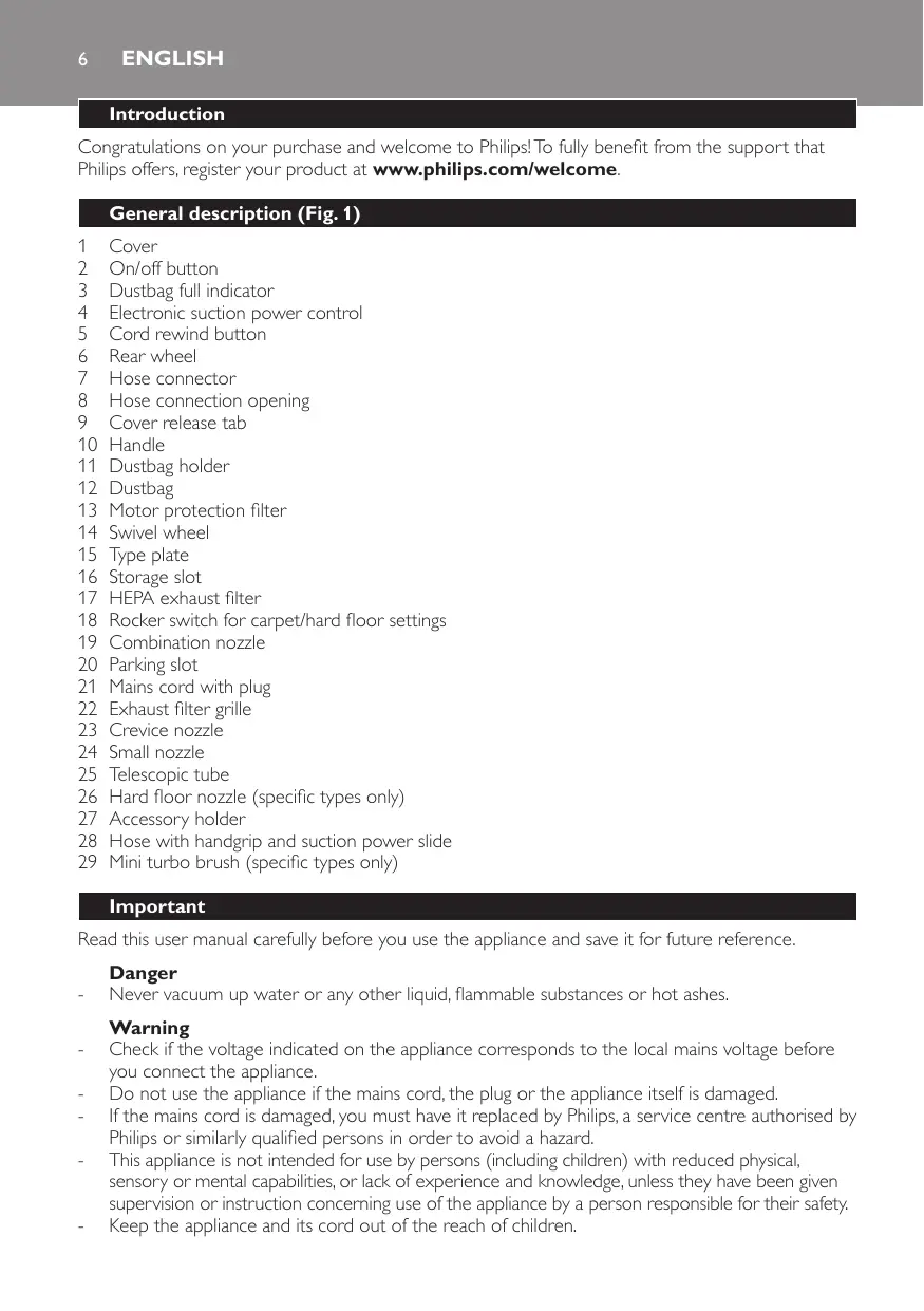 Danger -- Never vacuum up water or any other liquid, flammable substances or hot ashes. Warning -- Check if the voltage indicated on the appliance corresponds to the local mains voltage before you connect the appliance. -- Do not use the appliance if the mains cord, the plug or the appliance itself is damaged. -- If the mains cord is damaged, you must have it replaced by Philips, a service centre authorised by Philips or similarly qualified persons in order to avoid a hazard. -- This appliance is not intended for use by persons (including children) with reduced physical, sensory or mental capabilities, or lack of experience and knowledge, unless they have been given supervision or instruction concerning use of the appliance by a person responsible for their safety. -- Keep the appliance and its cord out of the reach of children.
