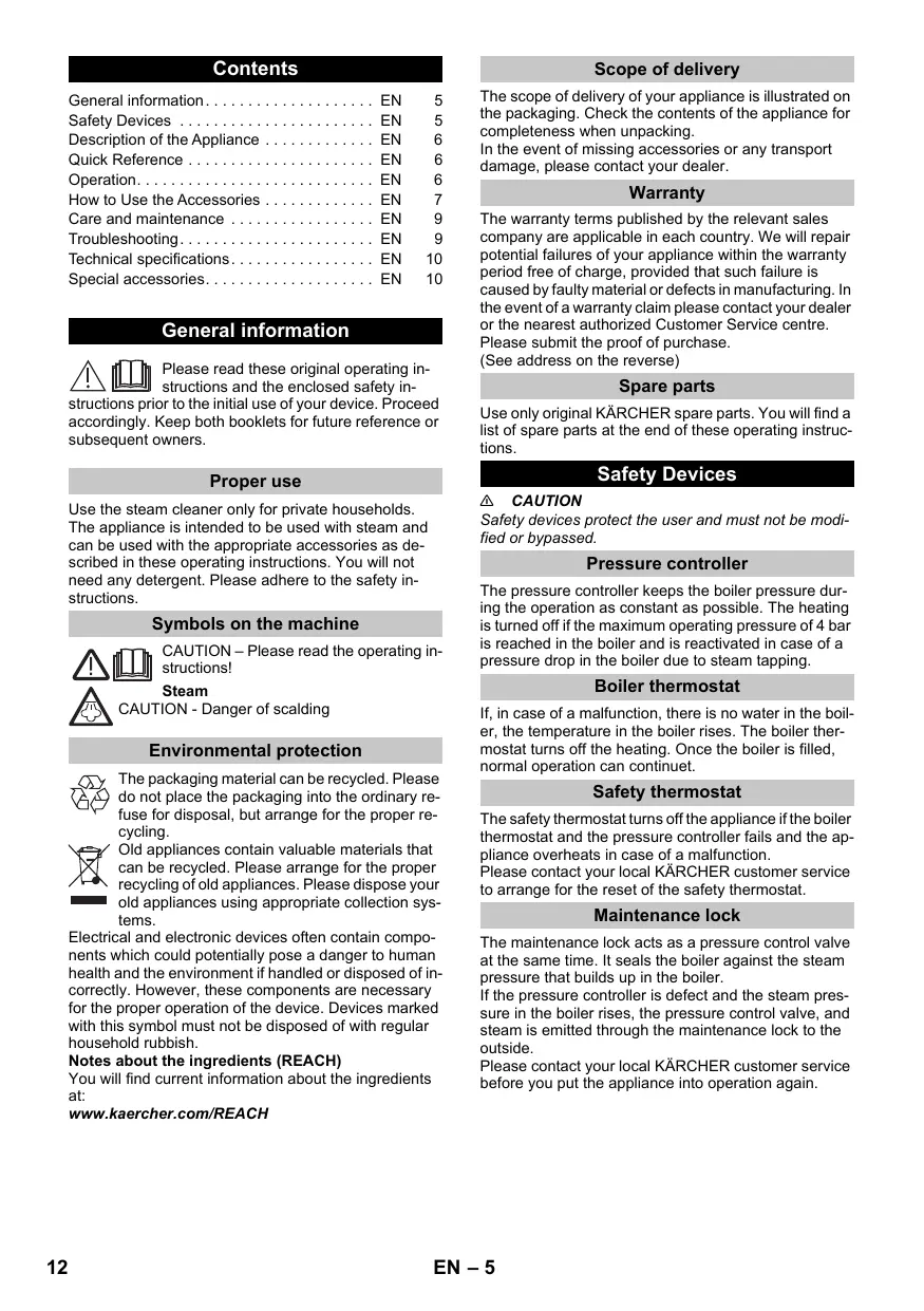 SC 5 Iron Plug SC 5 Iron Kit EN Quick reference FI Pikaohje HR Krakte upute SR Kratko uputstvo General information Please read these original operating instructions and the enclosed safety instructions prior to the initial use of your device. Proceed accordingly. Keep both booklets for future reference or subsequent owners. The scope of delivery of your appliance is illustrated on the packaging. Check the contents of the appliance for completeness when unpacking. In the event of missing accessories or any transport damage, please contact your dealer. Warranty The warranty terms published by the relevant sales company are applicable in each country. We will repair potential failures of your appliance within the warranty period free of charge, provided that such failure is caused by faulty material or defects in manufacturing. In the event of a warranty claim please contact your dealer or the nearest authorized Customer Service centre. Please submit the proof of purchase. (See address on the reverse) Spare parts Use only original KÄRCHER spare parts. You will find a list of spare parts at the end of these operating instructions. Safety Devices Proper use 몇 CAUTION Safety devices protect the user and must not be modified or bypassed. Use the steam cleaner only for private households. The appliance is intended to be used with steam and can be used with the appropriate accessories as described in these operating instructions. You will not need any detergent. Please adhere to the safety instructions. Pressure controller Symbols on the machine CAUTION – Please read the operating instructions! Steam CAUTION - Danger of scalding Environmental protection The packaging material can be recycled. Please do not place the packaging into the ordinary refuse for disposal, but arrange for the proper recycling. Old appliances contain valuable materials that can be recycled. Please arrange for the proper recycling of old appliances. Please dispose your old appliances using appropriate collection systems. Electrical and electronic devices often contain components which could potentially pose a danger to human health and the environment if handled or disposed of incorrectly. However, these components are necessary for the proper operation of the device. Devices marked with this symbol must not be disposed of with regular household rubbish. Notes about the ingredients (REACH) You will find current information about the ingredients at: www.kaercher.com/REACH