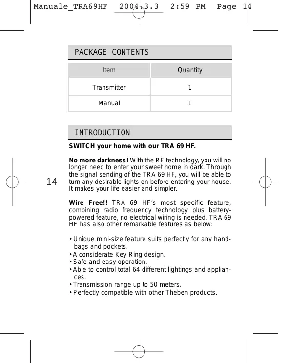 TRA 69 HF is fully compatible with other Theben product that allows the user to integrate any desired quantities with TRA 69 HF to build up a specific user network of transmitters and receivers at home, office and small-scaled store. Please refer to the following chart which is used to illustrate the typical compatible machines. Transmitter Receiver REC 100 HF Outdoor/Indoor 10A Receiver