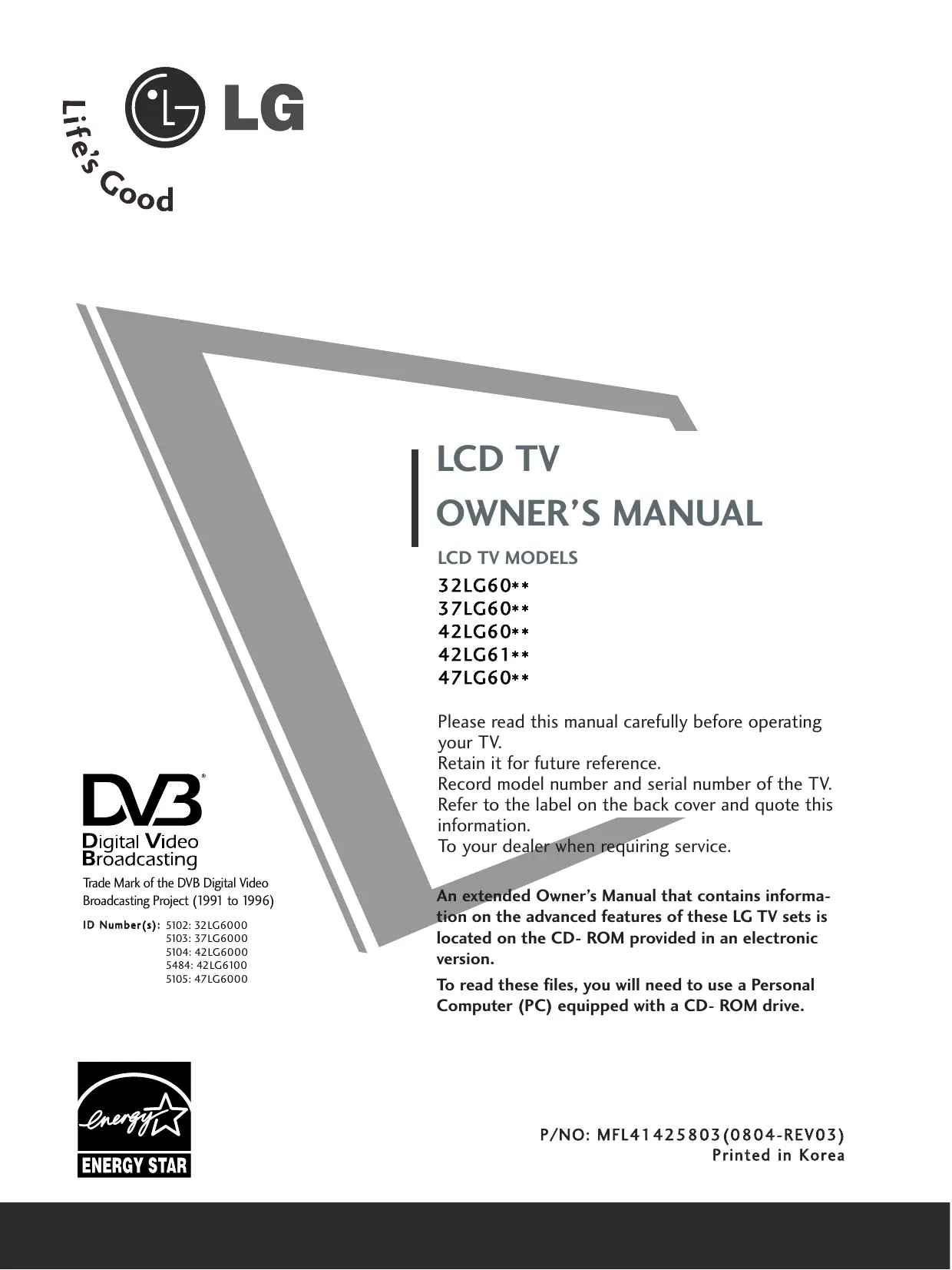 Download the instructions for your Téléviseur in PDF format for free! Find your manual 426100 - LG and take your electronic device back in hand. On this page are published all the documents necessary for the use of your device. 426100 by LG.
