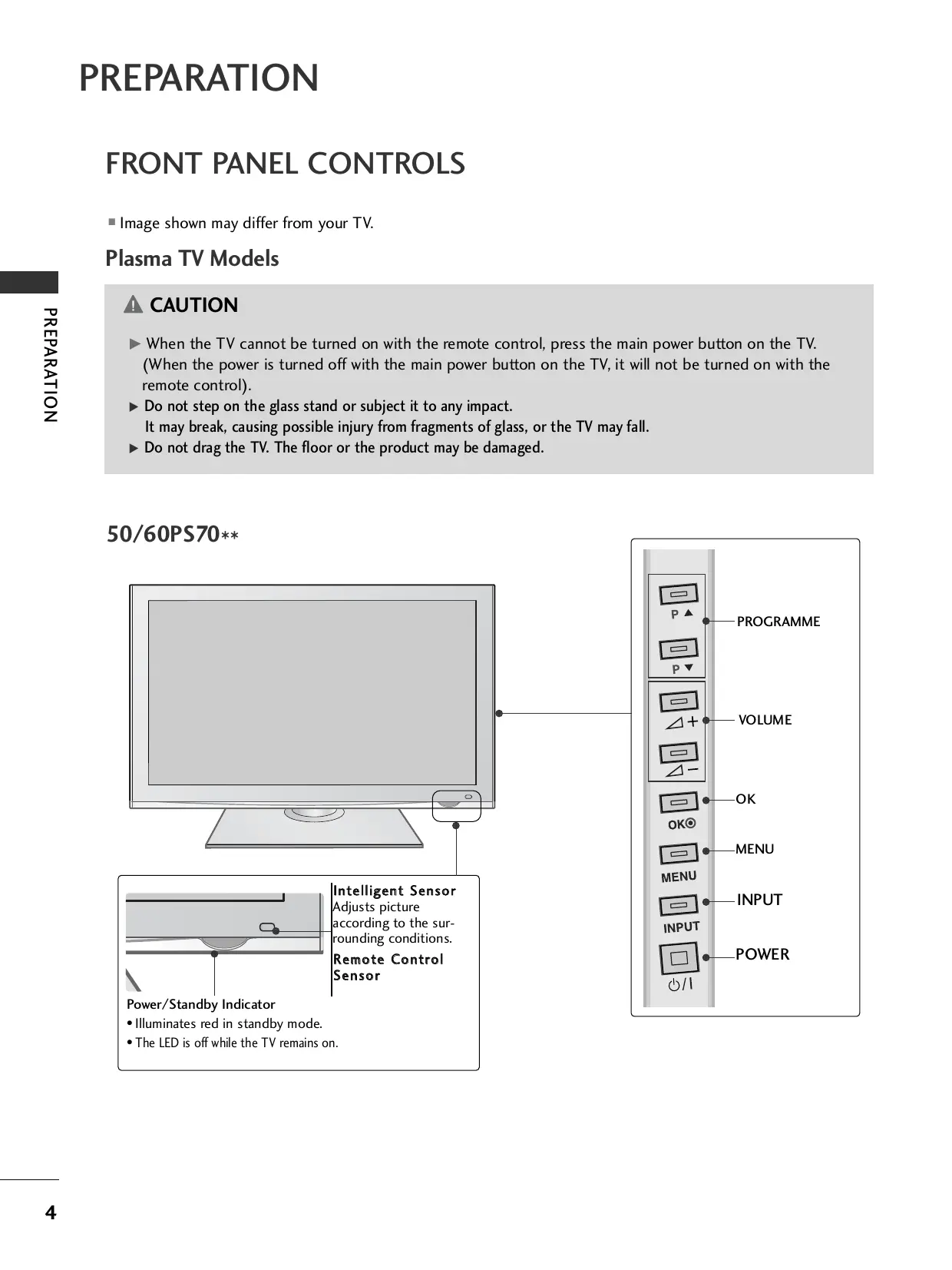 # Image shown may differ from your TV. Plasma TV Models À CAUTION > When the TV cannot be turned on with the remote control, press the main power button on the TV. (When the power is turned off with the main power button on the TV, it will not be turned on with the remote control). > Do not step on the glass stand or subject it to any impact. It may break, causing possible injury from fragments of glass, or the TV may fall. > Do not drag the TV. The floor or the product may be damaged. 50/60PS70+x+ P À #1 PROGRAMME Se | | +8 — voiumE = ex w oKk® EME MENU Intelligent Sensor ss 4 djusts picture El INPUT a hccording to the sur- INPUT lounding conditions. [Remote Control e—POWER \ Sensor 6 o/1 Power/Standby Indicator + Illuminates red in standby mode. + The LED is off while the TV remains on.